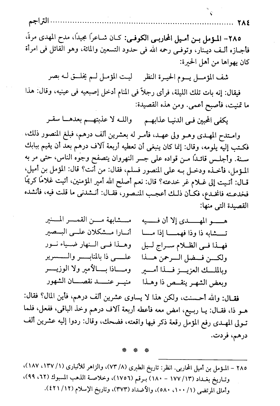 المؤمل بن أميل: المحاربي الكوفي. كان شاعراً مجيداً. مدح المهدي مرةً فأجازه ألف دينار، وتوفي رحمه الله في حدود التسعين والمائة. وهو القائل في امرأة كان يهواها من أهل الحيرة