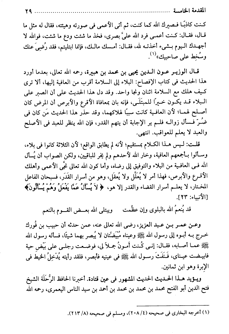 كنت كاذباً فصيرك الله كما كنت. ثم أتى الأعمى في صورته وهيئته فقال. له مثل ما قال. فقال: كنت أعمى فرد الله علي بصري. فخذ ما شئت ودع ما شئت. فوالله لا أجهدك اليوم بشيء أخذته لله. فقال: أمسك مالك فإنما ابتليتم فقد رضي عنك وسخط على صاحبيك. قال الوزير عون الدين يحيى بن محمد بن هبيرة رحمه الله تعالى، بعد ما أورد هذا الحديث في كتاب الإفصاح: البلاء إلى السلامة أقرب من العافية إليها. ألا ترى كيف هلك مع السلامة اثنان ونجا واحد. وقد دل هذا الحديث على أن الصبر على البلاء قد يكون خيراً للمبتلى فإنه بان بمعافاة الأقرع والأبرص أن المرض كان أصلح لهما، لأن العافية كانت سبباً لهلاكهما. وقد خذر هذا الحديث من كان في ضر فسأل زواله فلم ير الإجابة أن يتهم القدر فإن الله ينظر للعبد في الأصلح والعبد لا يعلم للعواقب. انتهى.