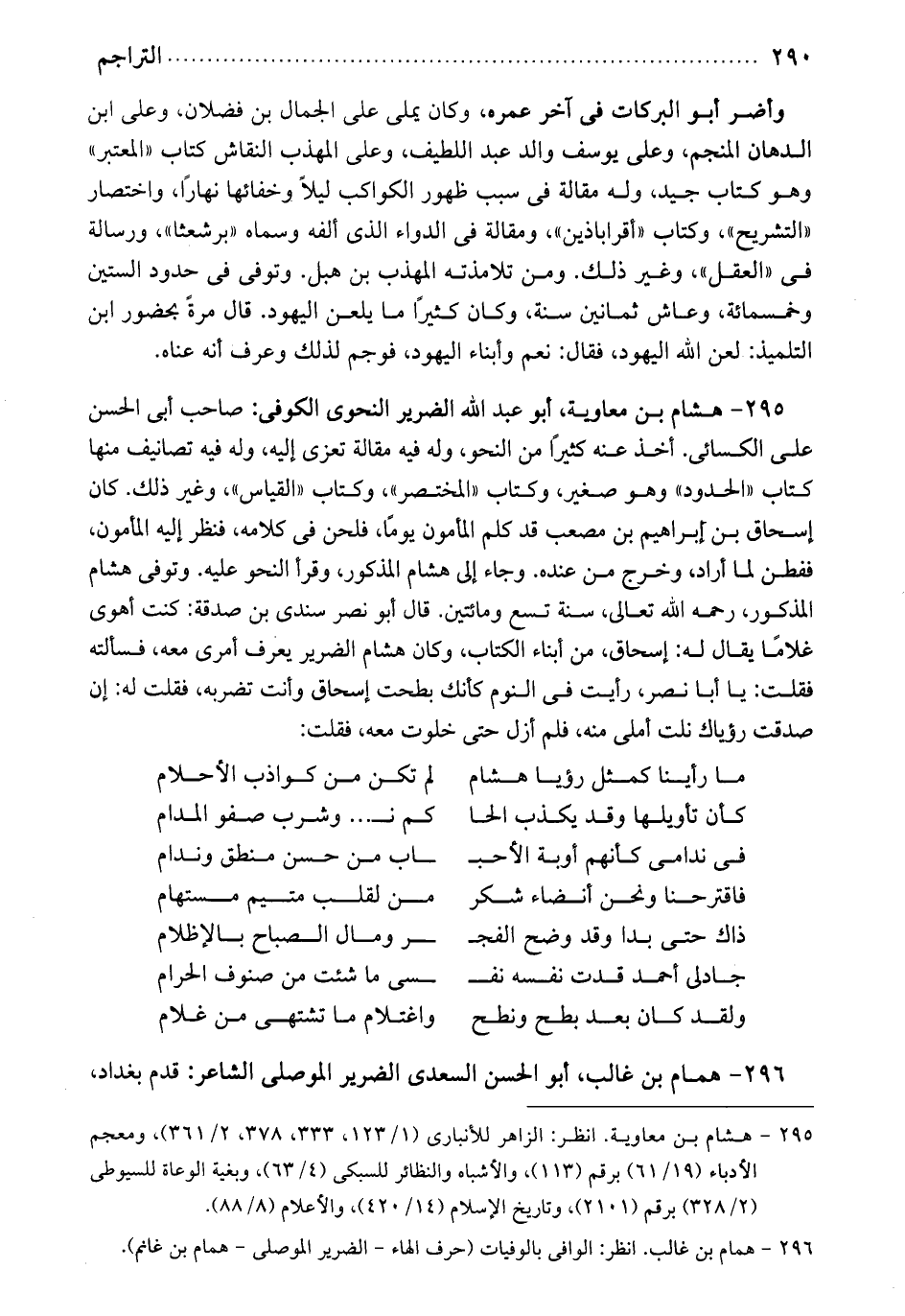 أبو عبد الله الضرير النحوي الكوفي. صاحب أبي الحسن على الكسائي. أخذ عنه كثيراً من النحو. وله فيه مقالة تعزى إليه. وله فيه تصانيف، منها: كتاب الحدود وهو صغير. وكتاب المختصر. وكتاب القياس. وغير ذلك، كان إسحاق بن إبراهيم بن مصعب قد كلم المامون يوماً فلحن في كلامه فنظر إليه المأمون ففطن لما أراد وخرج من عنده. وجاء إلى هشام المذكور وقرأ النحو عليه. وتوفي هشام المذكور رحمه الله تعالى سنة تسع ومائتين. قال أبو نصر سندي بن صدقة: كنت أهوى غلاماً يقال له إسحاق من أبناء الكتاب، وكان هشام الضرير يعرف أمري معه. فقال لي يوماً: يا أبا نصر رأيت في النوم كأنك بطحت إسحاق وأنت تضربه. فقلت له: إن صدقت رؤياك نلت أملي منه: فلم أزل حتى خلوت معه. فقلت: