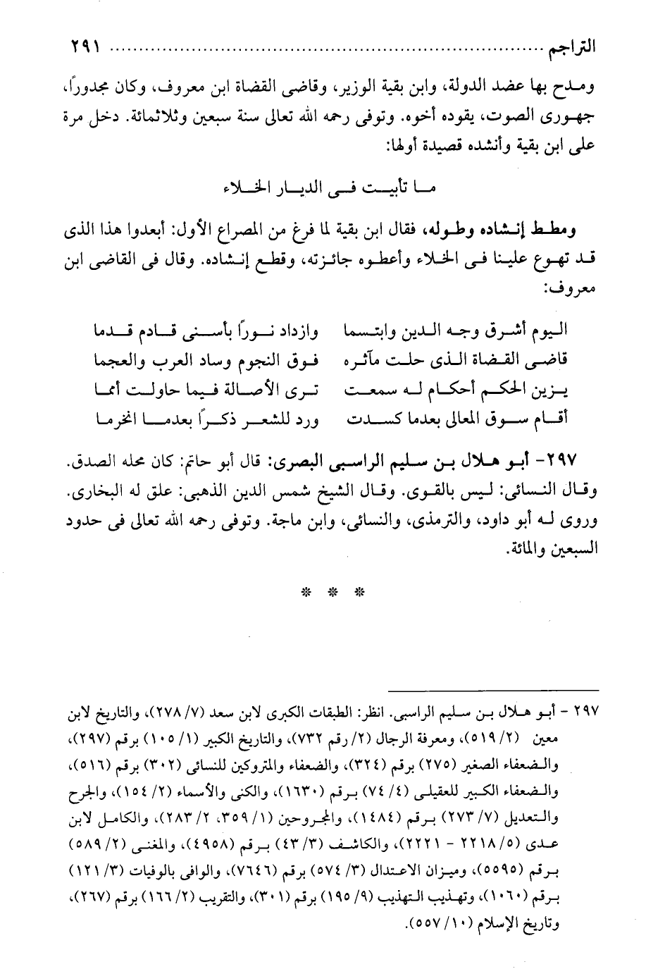 أبو هلال بن سليم: الراسبي البصري. قال أبو حاتم: كان محله الصدق. وقال النسائي: ليس بالقوي. وقال الشيخ شمس الدين الذهبي: علق له البخاري. وروى له أبو داود والترمذي والنسائي وابن ماجه. وتوفي رحمه الله تعالى في حدود السبعين والمائة.