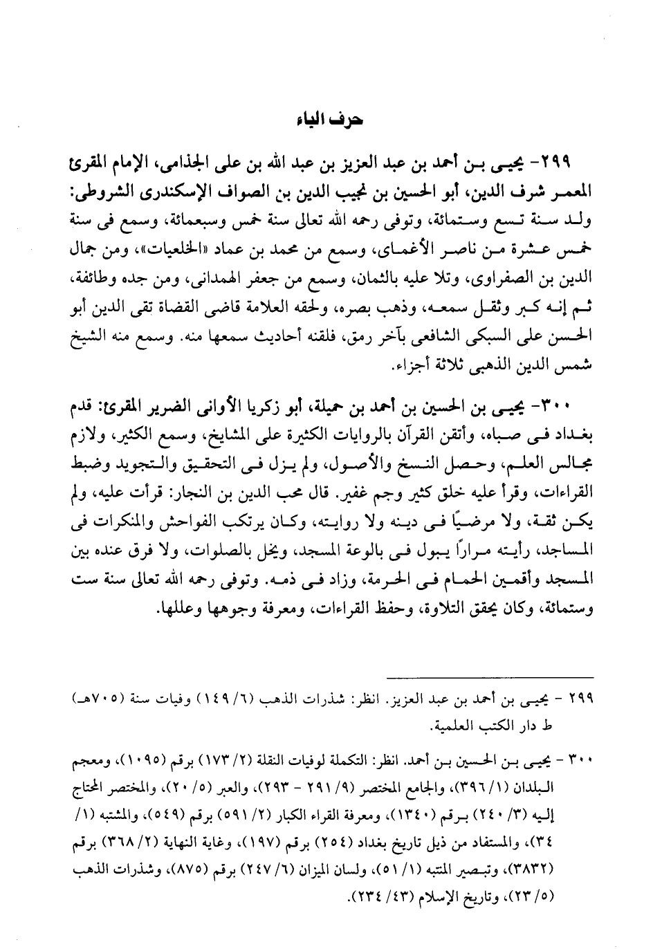 بن عبد العزيز بن عبد الله بن علي. الجذامي الإمام المقرئ المعمر. شرف الدين. أبو الحسين بن نجيب الدين بن الصواف الإسكندري الشروطي. ولد سنة تسع وستمائة. وتوفي رحمه الله تعالى سنة خمس وسبعمائة. وسمع في سنة خمس عشرة من ناصر الأغماي، وسمع من محمد بن عماد، الخلعيات. ومن جمال الدين ابن الصفراوي، وتلا عليه بالثمان. وسمع من جعفر بالهداني، ومن جده، وطائفة. ثم إنه كبر وثقل سمعه وذهب بصره. ولحقه العلامة قاضي القضاة تقي الدين أبو الحسن على السبكي الشافعي بآخر رمق، فلقنه أاديث سمعها نه. وسمع منه الشيخ شمس الدين الذهبي، ثلاثة أجزاء.