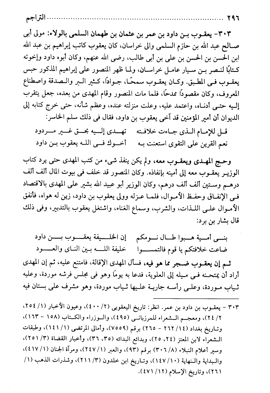 بن عمر بن عثمان بن طهمان. السلمي بالولاء. مولى أبي صالح عبد الله بن حازم السلمي والي خراسان. كان يعقوب كاتب إبراهيم بن عبد الله بن الحسن ابن الحسن بن علي بن أبي طالب رضي الله عنهم. وكان أبوه داود وأخوته كتاباً لنصر بن سيار عامل خراسان. ولما ظهر المنصور على إبراهيم المذكور حبس يعقوب في المطبق. وكان يعقوب سمحاً جواداً كثير البر والصدقة واصطناع المعروف. وكان مقصوداً ممدحاً، فلما مات المنصور وقام المهدي من بعده، جعل يتقرب إليه حتى أدناه واعتمد وعلت منزلته عنده وعظم شأنه، حتى خرج كتابه إلى الديوان، أن أمير المؤمنين قد آخى يعقوب بن داود. فقال في ذلك سلم الخاسر.