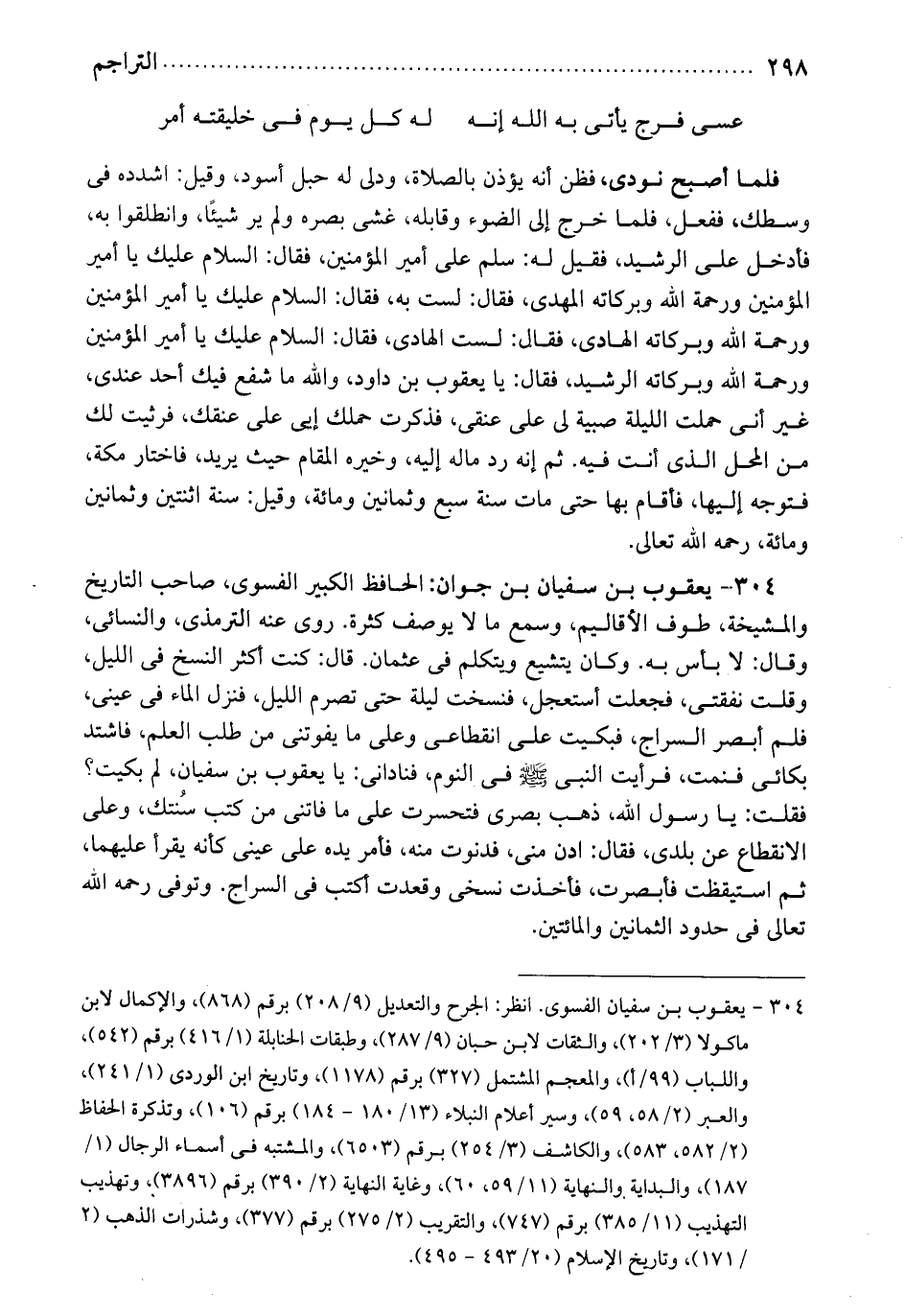 ين جوان الحافظ الكبير الفسوي صاحب التاريخ والمشيخة. طوف الأقاليم. وسمع ما لا يوصف كثرة. روى عنه الترمذي والنسائي وقال: لا بأس به، وكان يتشيع ويتكلم في عثمان. قال كنت أكثر النسخ في الليل وقلت نفقتي، فجعلت أستعجل فنسخت لبلة حتى تصرم الليل فنزل الماء في عيني. فلم أبصر السراج فبكيت على انقطاعي وعلى ما يفوتني من طلب العلم. فاشتد بكائي فنمت فرأيت النبي صلى الله عليه وسلم في النوم. فناداني: يا يعقوب بن سفيان لم بكيت؟ فقلت: يا رسول الله ذهب بصري فتحسرت على ما فاتني من كتب سنتك. وعلى الانقطاع عن بلدي. فقال: ادن مني قدنوت منه. فأمر يده على عيني كأنه يقرأ عليهما. ثم استيقظت. فأبصرت. فأخذت نسخي وقعدت أكتب في السراج. وتوفي رحمه الله تعالى في حدود الثمانين والمائتين.