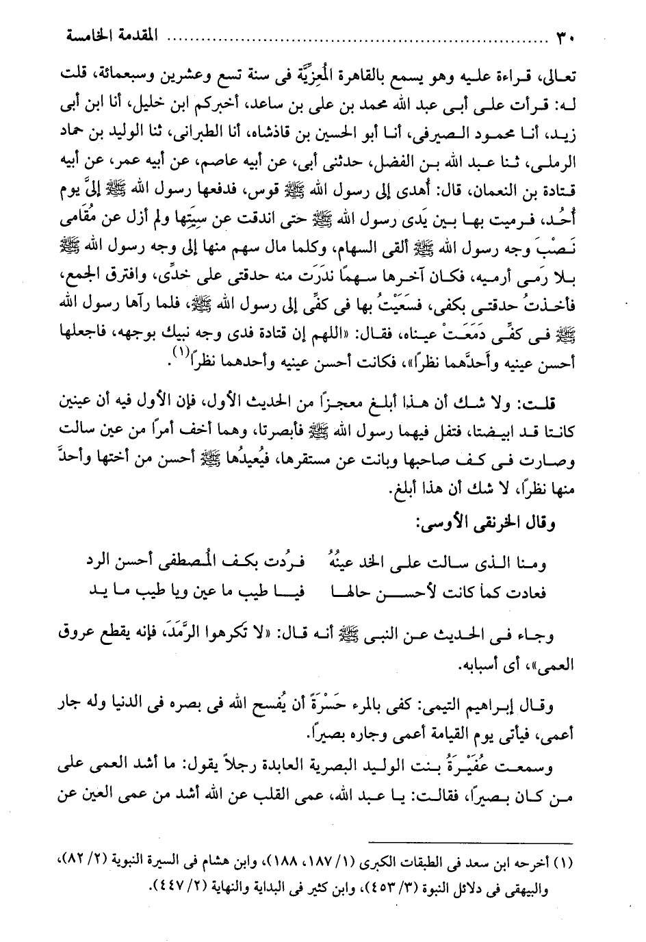 قلت: ولا شك أن هذا أبلغ معجزاً من الحديث الأول. فإن الأول فيه أن عينين كانتا قد ابيضتا. فتفل فيهما رسول الله صلى الله عليه وسلم فأبصرتا. وهما أخف أمراً من عين سالت وصارت في كف صاحبها وبانت عن مستقرها. فيعيدها صلى الله عليه وسلم أحسن من أختها وأحد منها نظراً. لا شك أن هذا أبلغ. وقال الخرنق الأوسي: