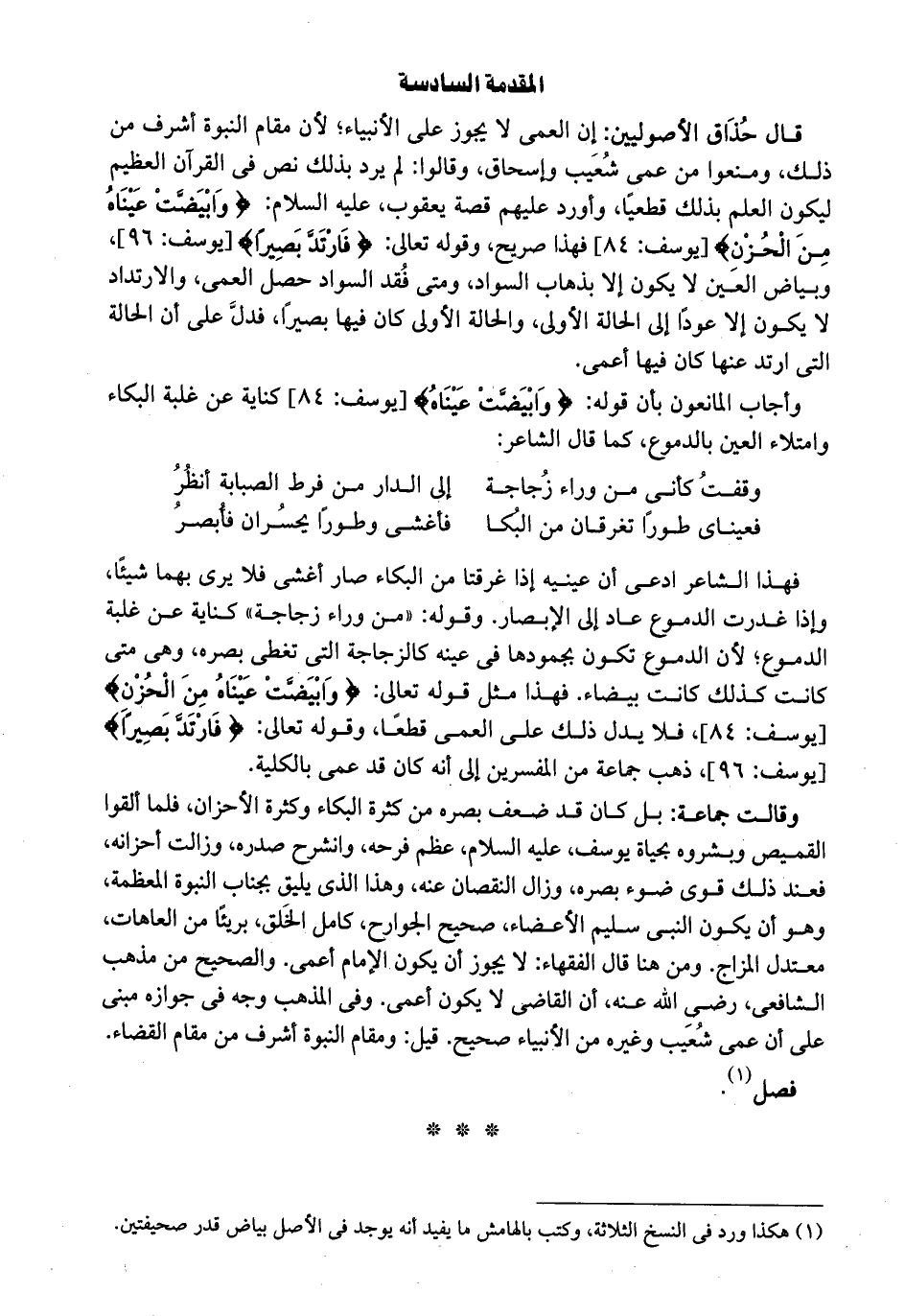 لأن مقام النبوة اشرف من ذلك. ومنعوا من عمى شعيب وإسحاق. وقالوا لم يرد بذلك نص في القرآن العظيم، ليكون العلم بذلك قطعياً. وأورد عليهم قصة يعقوب عليه السلام. وابيضت عيناه من الحزن فهذا صريح. وقوله تعالى: فارتد بصيراً. وبياض العين لا يكون إلا بذهاب السواد. ومتى فقد السواد حصل العمى. والارتداد لا يكون إلا عوداً إلى الحالة الأولى. والحالة الأولى كان فيها بصيراً. فدل على أن الحالة التي ارتد عنها كان فيها أعمى. وأجاب المانعون بأن قوله ابيضت عيناه كناية عن غلبة البكاء وامتلاء العين بالدموع، كما قال الشاعر