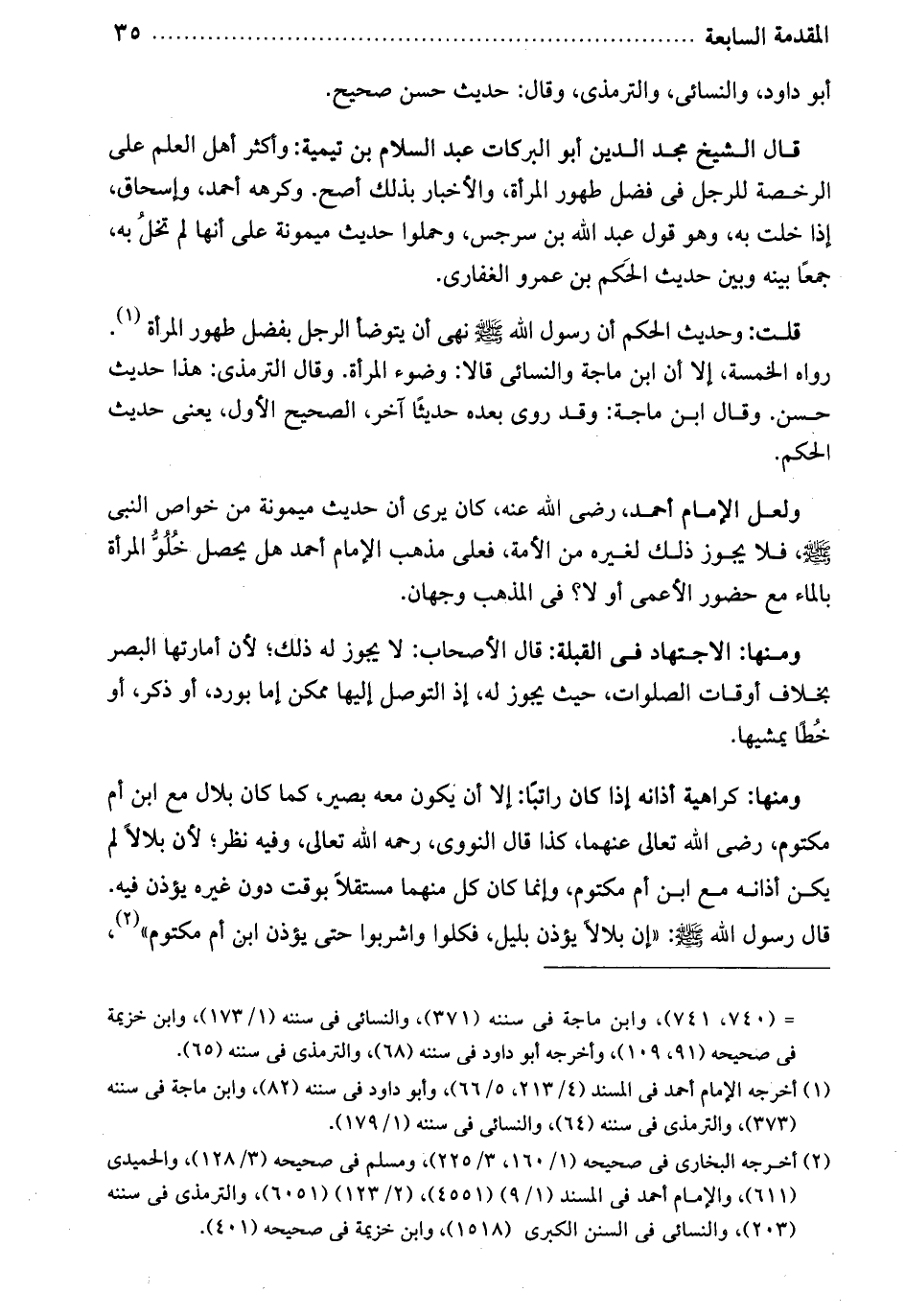 قلت: وحديث الحكم، أن رسول الله صلى الله عليه وسلم نهى أن يتوضأ الرجل بفضل طهور المرأة. رواه الخمسة، إلا أن ابن ماجه والنسائي قالا: وضوء المرأة: وقال الترمذي: هذا حديث حسن. وقال ابن ماجه وقد روى بعده حديثاً آخر الصحيح الأول. يعني حديث الحكم: ولعل الإمام أحمد رضي الله عنه كان يرى أن حديث ميمونة من خواص النبي صلى الله عليه وسلم، فلا يجوز ذلك لغيره من الأمة. فعلى مذهب الإمام أحمد هل يحصل خلو المرأة بالماء مع حضور الأعمى أولاً في المذهب وجهان.