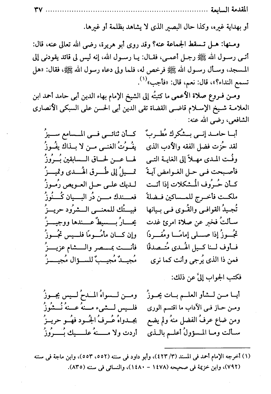ومن فروع صلاة الأعمى، ما كتبه إلى الشيخ الإمام بهاء الدين أبي حامد أحمد ابن العلامة شيخ الإسلام قاضي القضاة تقي الدين أبي الحسن علي السبكي الأنصاري الشافعي رضي الله عنه