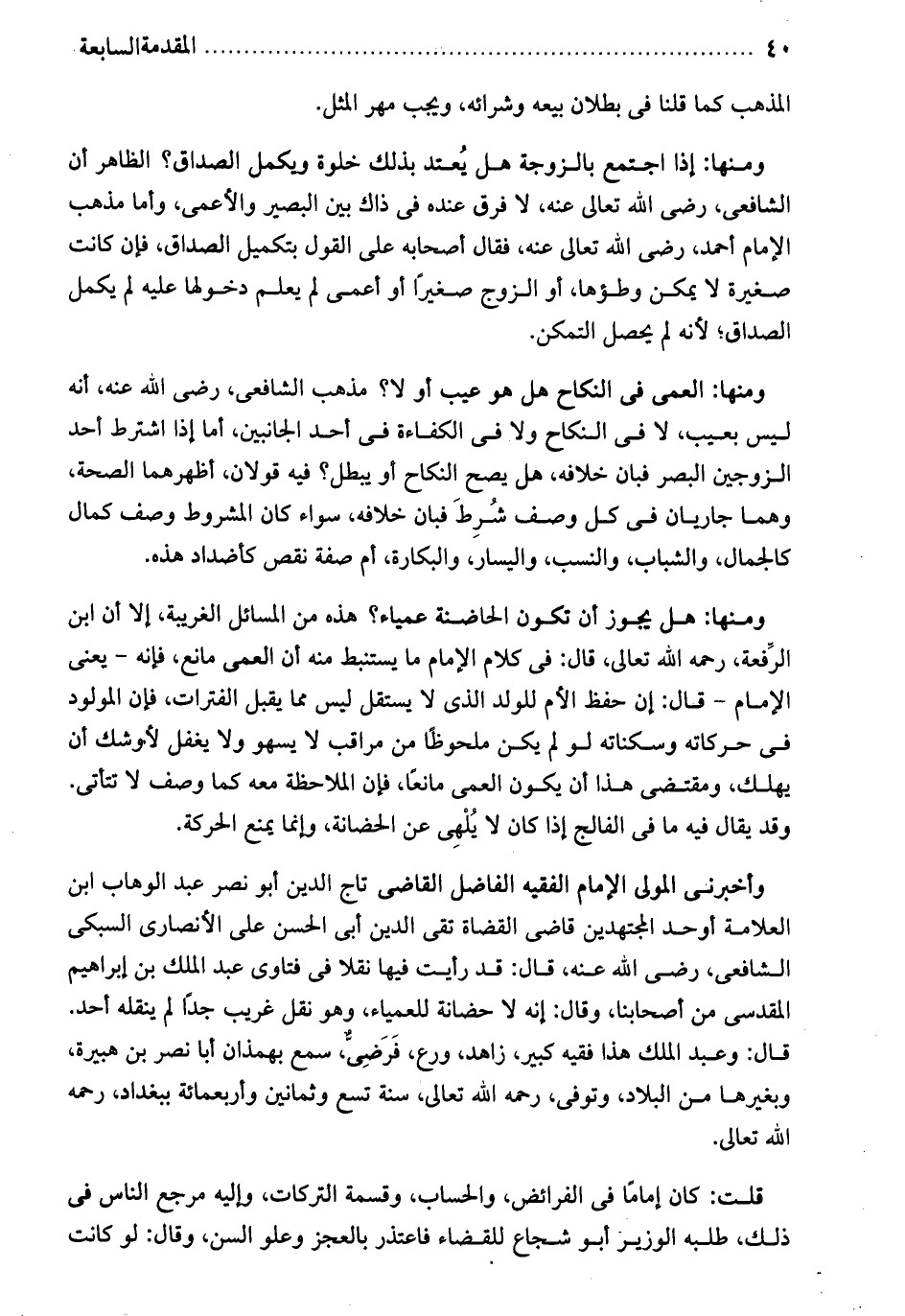 ومنها العمى في النكاح هل هو عيب أو لا؟ مذهب الشافعي رضي الله عنه أنه ليس بعيب، لا في النكاح ولا في الكفاءة في أحد الجانبين، أما إذا اشترط أحد الزوجين البصر فبان خلافه هل يصح النكاح أو يبطل؟ فيه قولان أظهرهما الصحة، وهما جاريان في كل وصف شرط فبان خلافه، سواء كان المشروط وصف كمال كالجمال والشباب والنسب واليسار والبكارة أم صفة نقص كأضداد هذه.