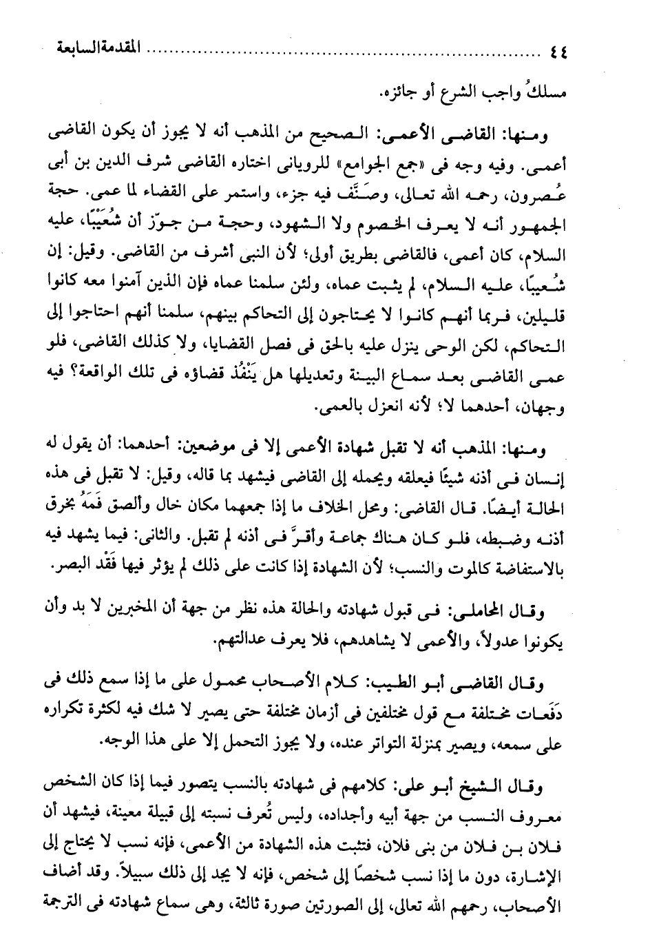 ومنها القاضي الأعمى، الصحيح من المذهب أنه لا يجوز أن يكون القاضي أعمى. وفيه وجه في جمع الجوامع للروياني اختاره القاضي شرف الدين بن أبي عصرون رحمه الله تعالى وصنف فيه جزأ واستمر على القضاء لما عمي. حجة الجمهور أنه لا يعرف الخصوم ولا الشهود. وحجة من جوز أن شعيباً عليه السلام كان أعمى فالقاضي بطريق أولى لأن النبي اشرف من القاضي. وقيل إن شعيباً عليه السلام لم يثبت عماه ولئن سلمنا عماه فإن الذين آمنوا معه كانوا قليلين. فربما أنهم كانوا لا يحتاجون إلى التحاكم بينهم، سلمنا أنهم احتاجوا إلى التحاكم لكن الوحي ينزل عليه بالحق في فصل القضايا، ولا كذلك القاضي. فلو عمي القاضي بعد سماع البينة وتعديلها، هل ينفذ قضاؤه في تلك الواقعة؟ فيه وجهان أحدهما لا، لأنه انعزل بالعمى.