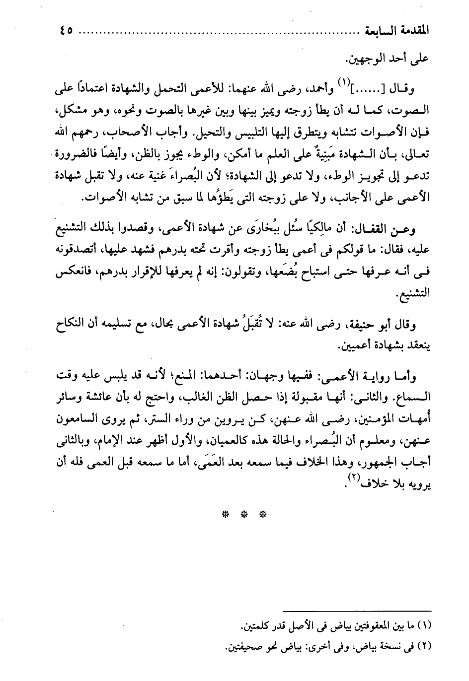 وقال. وأحمد رضي الله عنهما للأعمى التحمل والشهادة إعتماداً على الصوت، كماله أن يطا زوجته ويميز بينها وبين غيرها بالصوت ونحوه. وهو مشكل فإن الأصوات تتشابه ويتطرق إليها التلبيس والتحيل. وأجاب الأصحاب رحمهم الله تعالى بأن الشهادة مبنية على العلم ما أمكن، والوطء يجوز بالظن. وأيضاً فالضرورة تدعو إلى تجويز الوطء ولا تدعو إلى الشهادة، لأن البصراء غنية عنه ولا تقبل شهادة الأعمى على الأجانب ولا على زوجته التي يطؤها لما سبق من تشابه الأصوات. وعن القفال أن مالكياً سئل ببخارى عن شهادة الأعمى وقصدوا بذلك التشنيع عليه. فقال ما قولكم في أعمى يطأ زوجته وأقرت تحته بدرهم فشهد عليها أتصدقونه في انه عرفها حتى استباح بضعها وتقولون إنه لم يعرفها للإقرار بدرهم فانعكس التشنيع. وقال أبو حنيفة رضي الله عنه لا تقبل شهادة الأعمى بحال مع تسليمه أن النكاح ينعقد بشهادة أعميين.