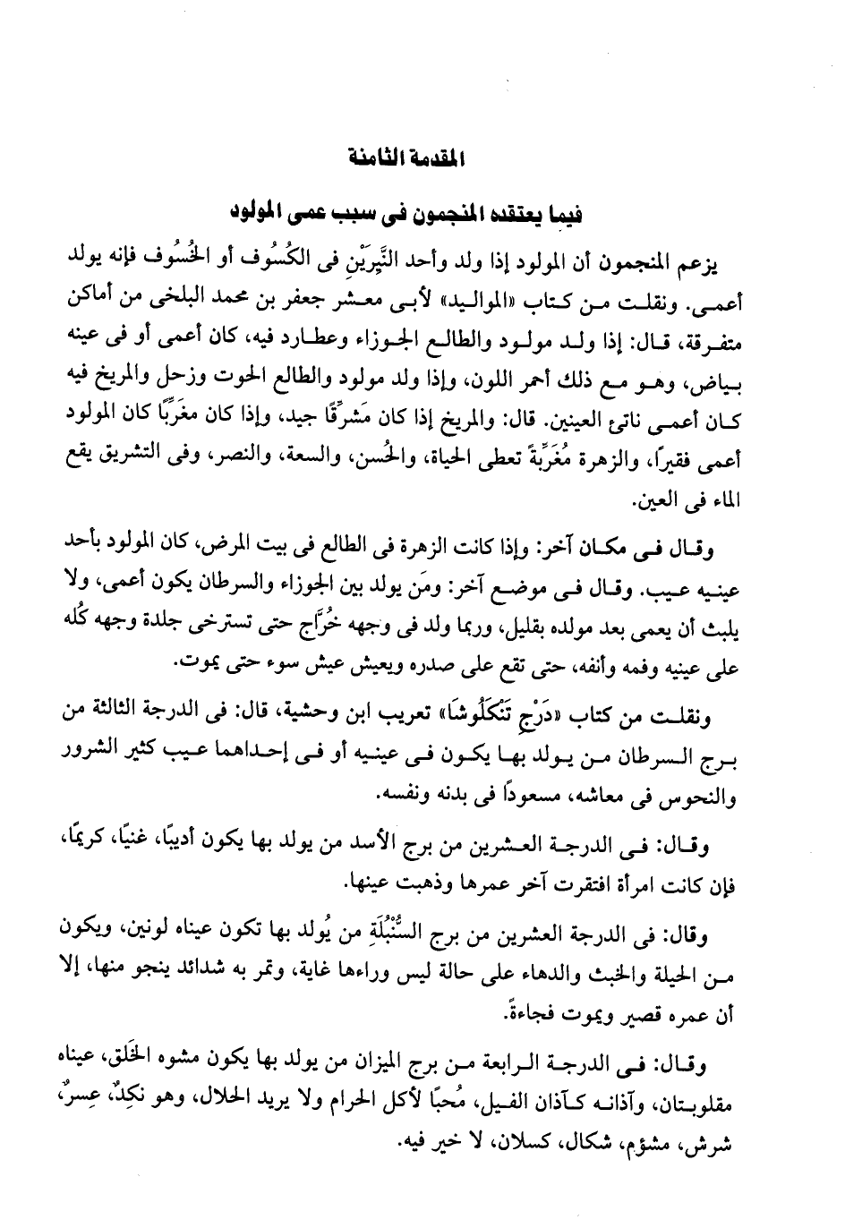ونقلت من كتاب المواليد لأبي معشر جعفر بن محمد البلخي من أماكن متفرقة. قال: إذا ولد مولود والطالع الجوزاء وعطارد فيه: كان أعمى أو في عينه بياض وهو مع ذلك أحمر اللون: وإذا ولد مولود والطالع الحوت وزحل والمريخ فيه كان أعمى ناتئ العينين. قال: والمريخ إذا كان مشرفاً جيد وإذا كان مغرباً كان المولود أعمى فقيراً. والزهرة مغربة تعطي الحياة والحسن والسعة والنصر. وفي التشريق يقع الماء في العين. وقال: في مكان آخر وإذا كانت الزهرة في الطالع في بيت المرض كان المولود بأحد عينيه عيب. وقال: في موضع آخر ومن يولد بين الجوزاء والسرطان يكون أعمى ولا يلبث أن يعمى بعد مولده بقليل وربما ولد في وجهه خراج حتى تسترخي جلدة وجهه كله على عينيه وفمه وأنفه حتى تقع على صدره ويعيش عيش سوء حتى يموت.
