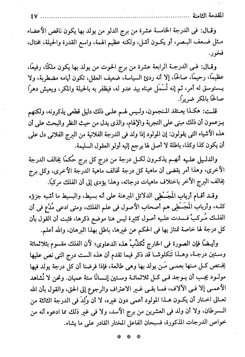 قلت هكا يعتقد المنجمون. وليس لهم على ذلك دليل قطعي يذكرونه ولكنهم يزعمون أن ذلك مبني على التجربة والإلهام. والذي يدل، من حيث النظر والبحث، على أن هذه الأشياء التي يقولون إن المولود إذا ولد في الدرجة الفلانية من البرج الفلاني دل على أن يكون كذا وكذا، باطلة لا اصل لها يرجع إليه أولو العقول السليمة.