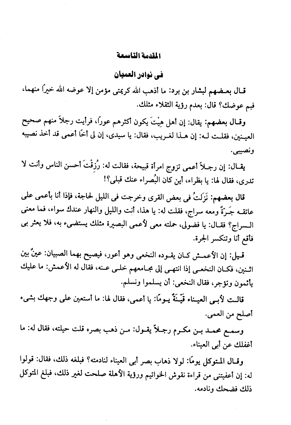 يقال: إن رجلاً أعمى تزوج امرأة قبيحة: فقالت له: رزقت أحسن الناس وأنت لا تدري. فقال لها: يا بظراء! أين كان البصراء عنك قبلي؟ قال بعضهم: نزلت في بعض القرى وخرجت في الليل لحاجة فإذا أنا بأعمى على عاتقه جرة ومعه سراج. فقلت له: يا هذا؟ أنت والليل والنهار عندك سواء! فما معنى السراج؟ فقال: يا فضولي! حملته معي لأعمى البصيرة مثلك، يستضيء به. فلا يعثر بي فأقع أنا وتنكسر الجرة.