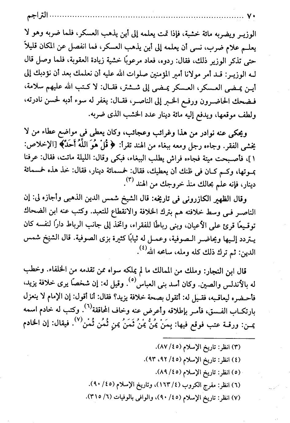الوزير ويضربه مائة خشبة فإذا تمت يعلمه إلى أين يذهب العسكر؟ فلما ضربه وهو لا يعلم علام ضرب، نسي أن يعلمه إلى أين يذهب العسكر فما انفصل عن المكان قليلاً حتى تذكر الوزير ذلك. فقال ردوه فعاد مرعو بأخشية زيادة العقوبة، فلما وصل، قال له الوزير قد أمر مولانا أمير المؤمنين صلوات الله عليه أن نعلمك بعد أن نؤدبك إلى أين يمضي العسكر، العسكر يمضي إلى ششتر، فقال: لا كتب الله عليهم سلامة. فضحك الحاضرون، ورفع الحبر إلى الناصر. فقال: يغفر له سوء أدبه، لحس نادرته، ولطف موقعها، ويدفع إليه مائة دينار، عدد الخشب الذي ضربه.