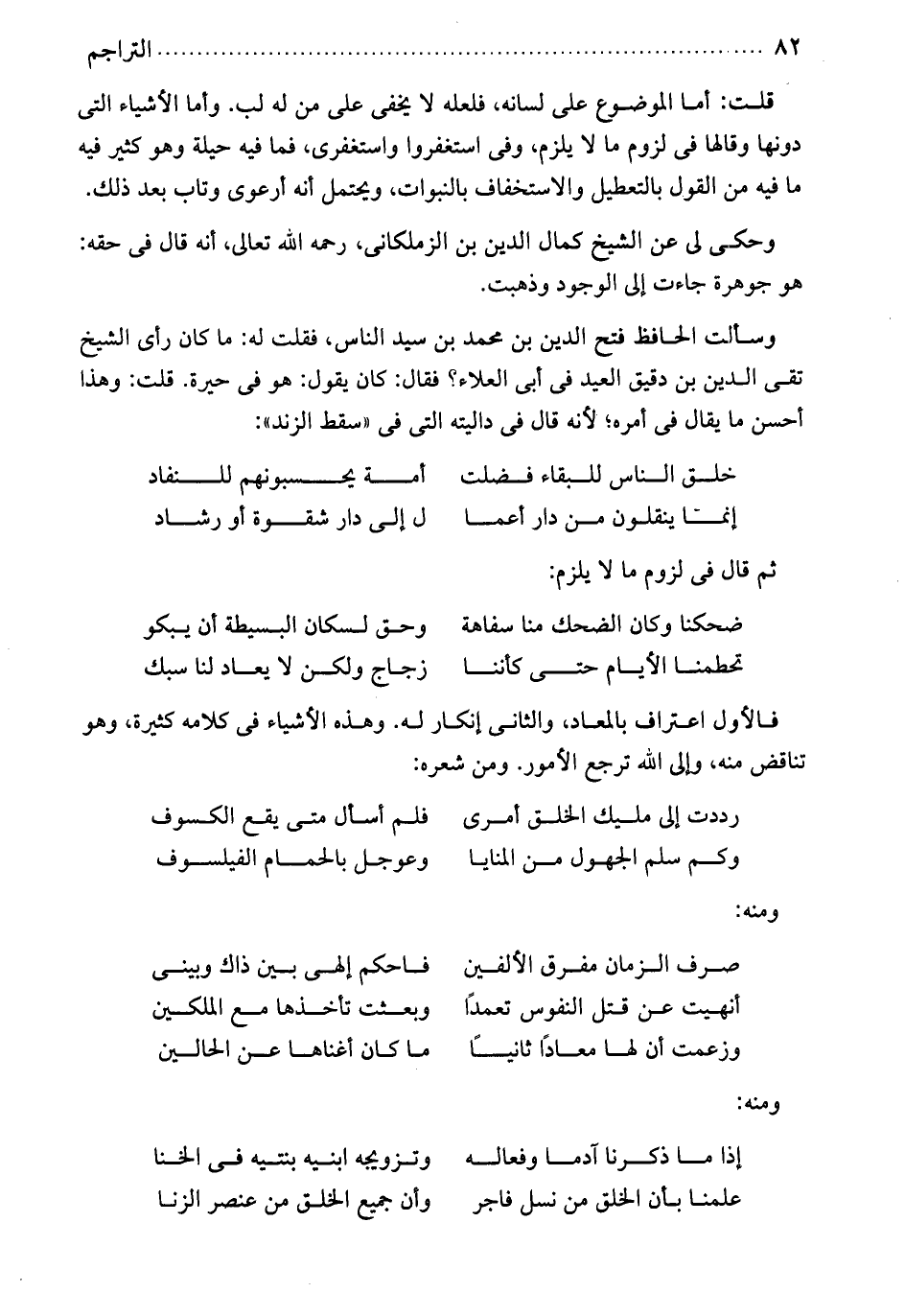 فالأول اعتراف بالمعاد. والثاني إنكار له. وهذه الأشياء في كلامه كثيرة وهو تناقض منه وإلى الله ترجع الأمور. ومن شعره: