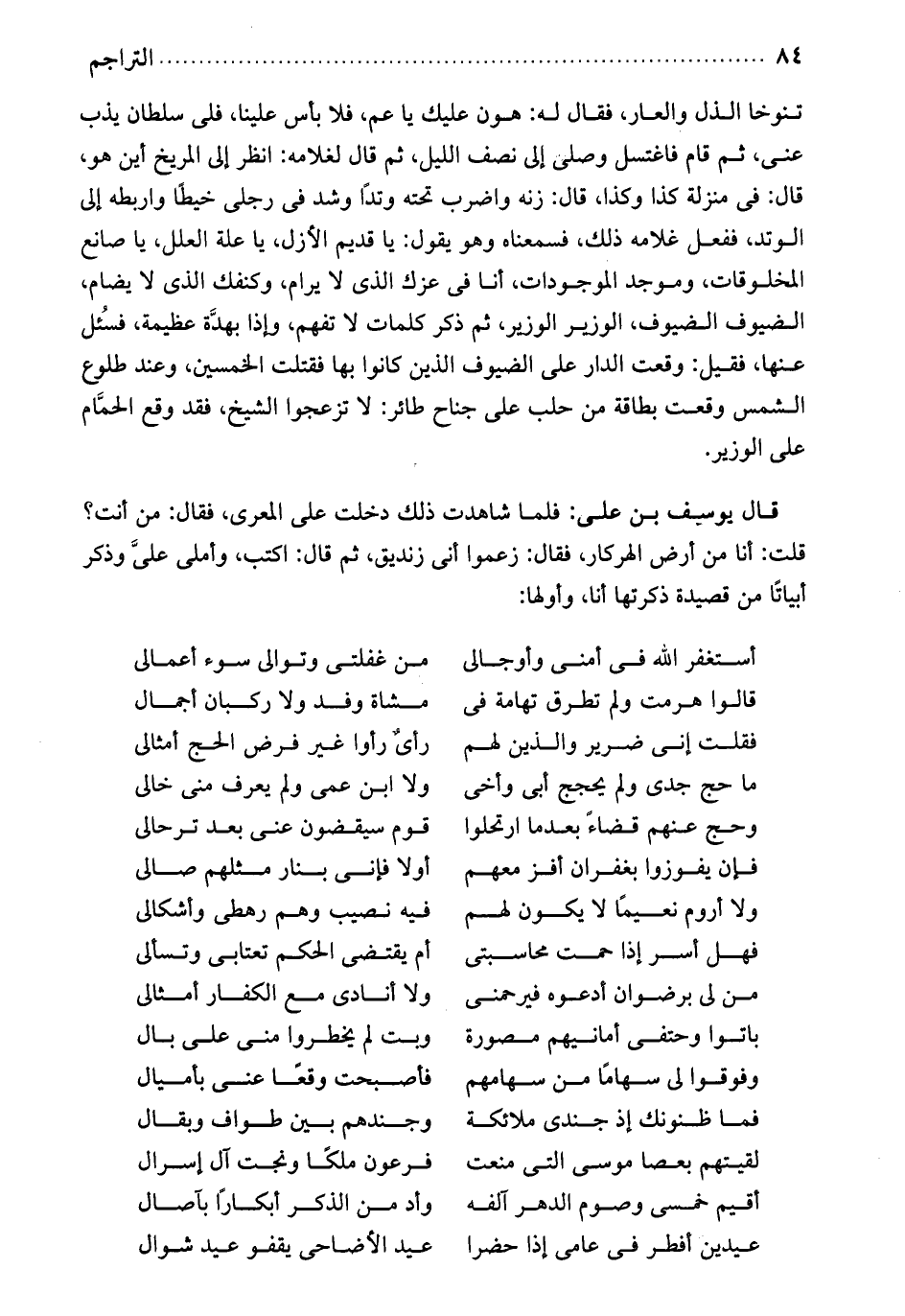 تنوخا الذل والعار. فقال له: هون عليك يا عم فلا بأس علينا فلي سلطان يذب عني. ثم قام فاغتسل وصلى إلى نصف الليل. ثم قال لغلامه انظر إلى المريخ أين هو، قال في منزلة كذا وكذا. قال زنه واضرب تحته وتداً وشد في رجلي خيطاً واربطه إلى الوتد، ففعل غلامه ذلك. فسمعناه وهو يقول، يا قديم الأزل، يا علة العلل، يا صانع المخلوقات، وموجد الموجودات، أنا في عزك الذي لا يرام، وكنفك الذي لا يضام، الضيوف الضيوف، الوزير الوزير. ثم ذكر كلمات لا تفهم. وإذا بهدة عظيمة؟ فسئل عنها: فقيل وقعت الدار على الضيوف الذين كانوا بها فقتلت الخمسين، وعند طلوع الشمس وقعت بطاقة من حلب على جناح طائر لا تزعجوا الشيخ فقد وقع الحمام على الوزير. قال يوسف بن علي: فلما شاهدت ذلك دخلت على المعري، فقال: من أنت، قلت: أنا من أرض الهركار فقال زعموا أني زنديق، ثم قال أكتب، وأملي على وذكر أبياتاً من قصيدة ذكرتها أنا: وأولها