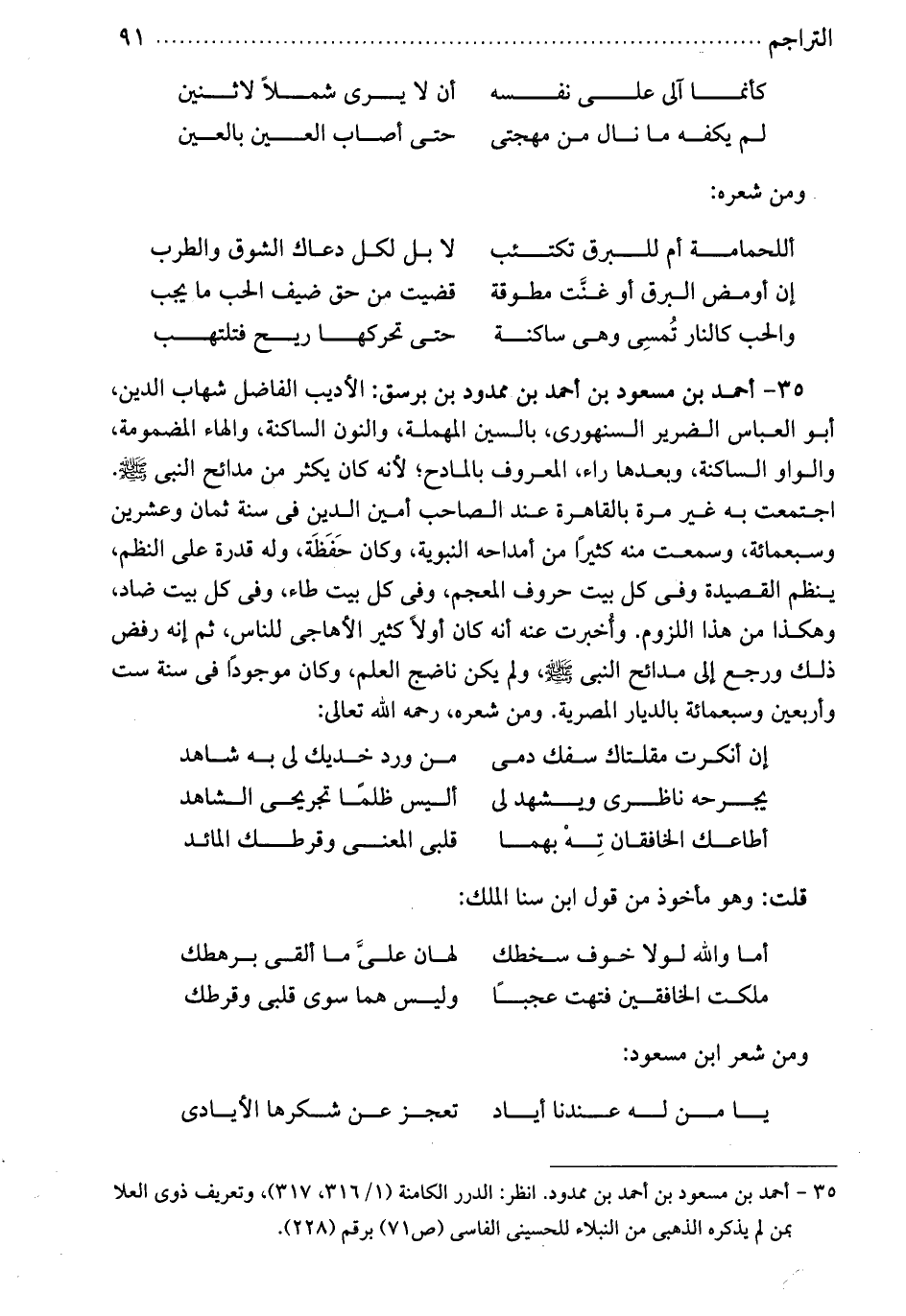 أحمد بن مسعود: بن احمد بن ممدود بن برسق. الأديب الفاضل شهاب الدين أبو العباس الضرير السنهوري، بالسين المهملة والنون الساكنة والهاء المضمومة والواو الساكنة وبعدها راء. المعروف بالمادح: لأنه كان يكثر من مدائح النبي صلى الله عليه وسلم. اجتمعت به غير مرة بالقاهرة عند الصاحب أمين الدين، في سنة ثمان وعشرين وسبعمائة، وسمعت منه كثيراً من أمداحه النبوية. وكان حفظة. وله قدرة على النظم، ينظم القصيدة، وفي كل بيت حروف المعجم، وفي كل بيت طاء، وفي كل بيت ضاد، وهكذا من هذا اللزوم. وأخبرت عنه أنه كان أولاً كثير الأهاجي للناس، ثم إنه رفض ذلك ورجع إلى مدائح النبي صلى الله عليه وسلم. ولم يكن ناضج العلم. وكان موجوداً في سنة ست وأربعين وسبعمائة بالديار المصرية. ومن شعره رحمه الله تعالى.