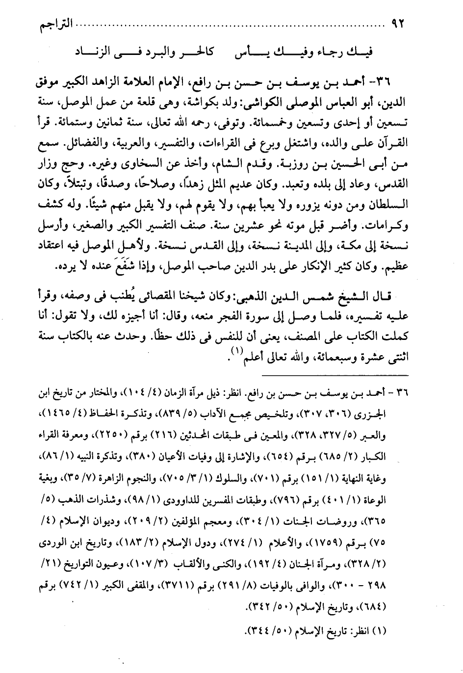 أحمد بن يوسف: بن حسن بن رافع. الإمام العلامة الزاهد الكبير، موفق الدين أبو العباس الموصلي الكواشي. ولد بكواشة وهي قلعة من عمل الموصل، سنة تسعين أو إحدى وتسعين وخمسمائة. وتوف رحمه الله تعالى سنة ثمانين وستمائة. قرا القرآن على والده، واشتغل وبرع في القراآت والتفسير والعربية والفضائل. سمع من أبي الحسين بن روزبة. وقدم الشام وأخذ عن السخاوي وغيره. وحج وزار القدس وعاد إلى بلده وتعبد. وكان عديم المثل: زهد وصلاحاً وصدقاً وتبتلاً. وكان السلطان ومن دونه يزوره ولا يعبأ بهم، ولا يقوم لهم، ولا يقبل منهم شيئاً. وله كشف وكرامات. وأضر قبل موته نحو عشرين سنة. صنف التفسير الكبير والصغير وأرسل نسخة إلى مكة، وإلى المدينة نسخة، وإلى القدس نسخة. ولأهل الموصل فيه اعتقاد عظيم. وكان كثير الإنكار على بدر الدين صاحب الموصل وإذا شفع عنده، لا يرده.