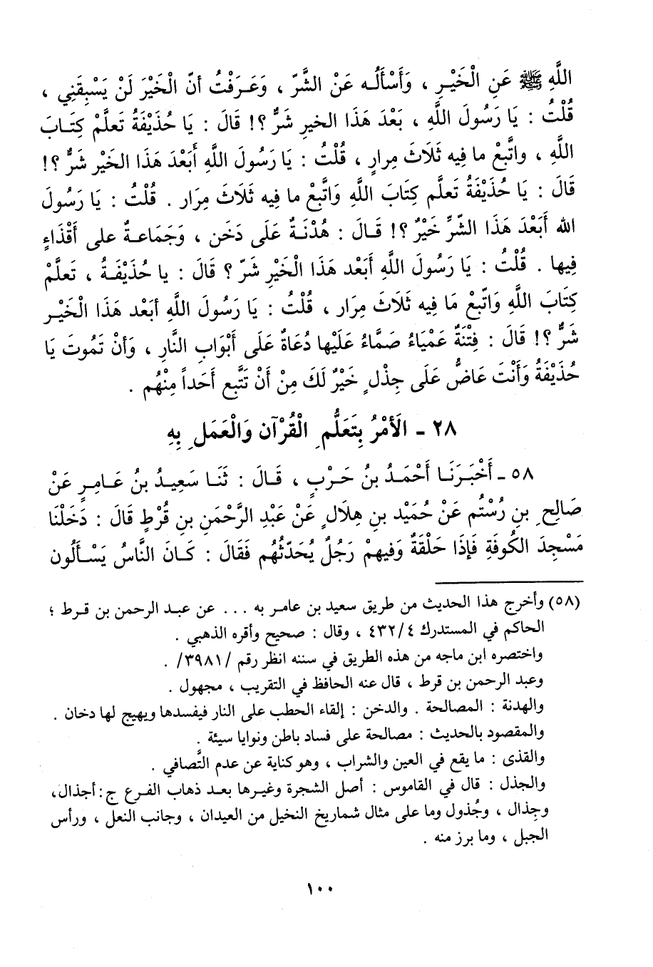 الله عَن الْخَيْر وأسأله عَن الشَّرّ وَعرفت أَن الْخَيْر لن يسبقني قلت يَا رَسُول الله بعد هَذَا الْخَيْر شَرّ قَالَ يَا حُذَيْفَة تعلم كتاب الله وَاتبع مَا فِيهِ ثَلَاث مرار قلت يَا رَسُول الله أبعد هَذَا الْخَيْر شَرّ قَالَ يَا حُذَيْفَة تعلم كتاب الله وَاتبع مَا فِيهِ ثَلَاث مرار قلت يَا رَسُول الله أبعد هَذَا الشَّرّ خير قَالَ هدنة على دخن وَجَمَاعَة على أقذاء فِيهَا قلت يَا رَسُول الله أبعد هَذَا الْخَيْر شَرّ قَالَ يَا حُذَيْفَة تعلم كتاب الله وَاتبع مَا فِيهِ ثَلَاث مرار قلت يَا رَسُول الله أبعد هَذَا الْخَيْر شَرّ قَالَ فتْنَة عمياء صماء عَلَيْهَا دعاة على أَبْوَاب النَّار وَأَن تَمُوت يَا حُذَيْفَة وَأَنت عاض على جذل خير لَك من أَن تتبع أحدا مِنْهُم