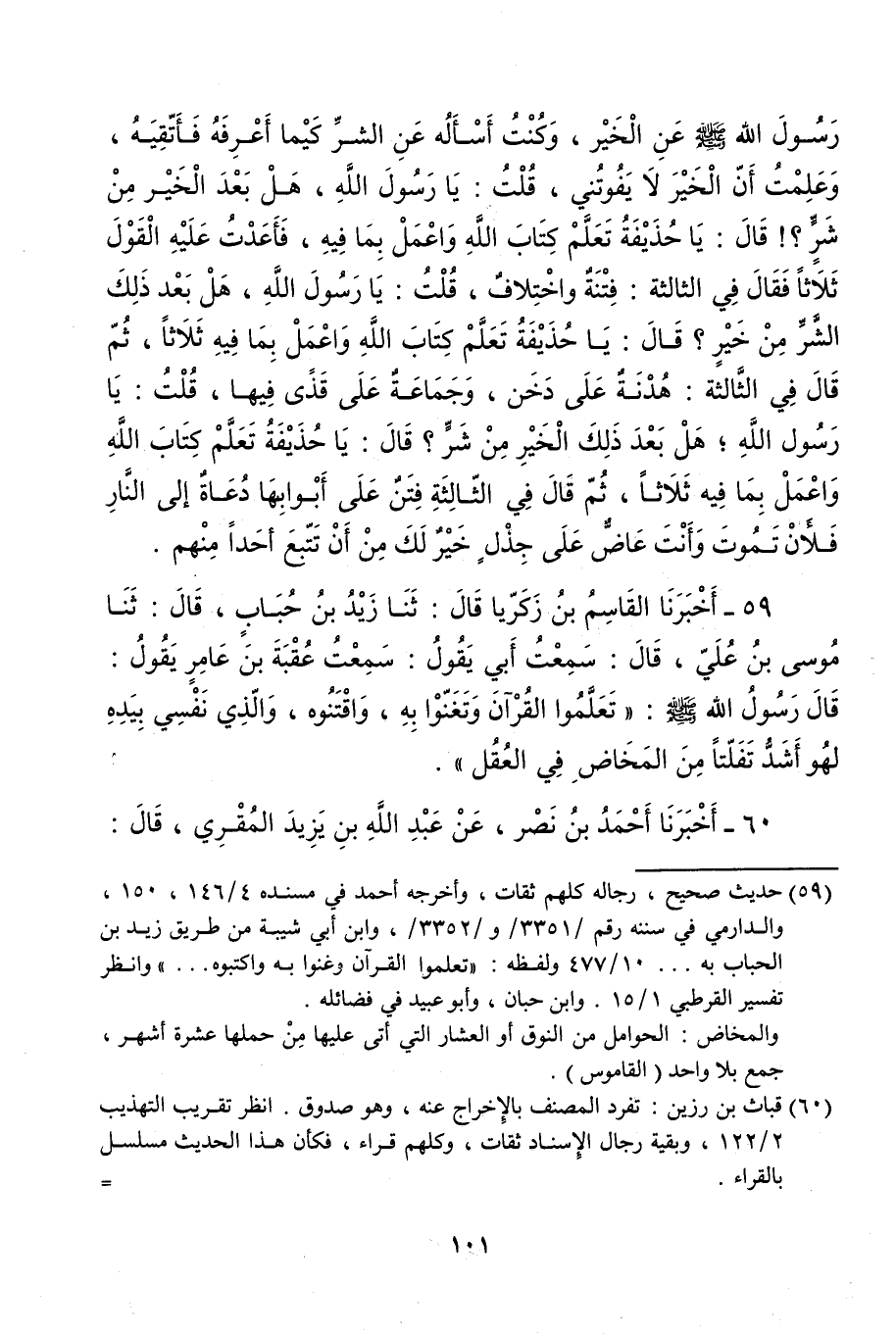 59 - أخبرنَا الْقَاسِم بن زَكَرِيَّا قَالَ ثَنَا زيد بن حباب قَالَ ثَنَا مُوسَى بن عَليّ قَالَ سَمِعت أبي يَقُول سَمِعت عقبَة بن عَامر يَقُول قَالَ رَسُول الله تعلمُوا الْقُرْآن وَتَغَنوا بِهِ واقتنوه وَالَّذِي نَفسِي بِيَدِهِ لَهو أَشد تفلتا من الْمَخَاض فِي الْعقل