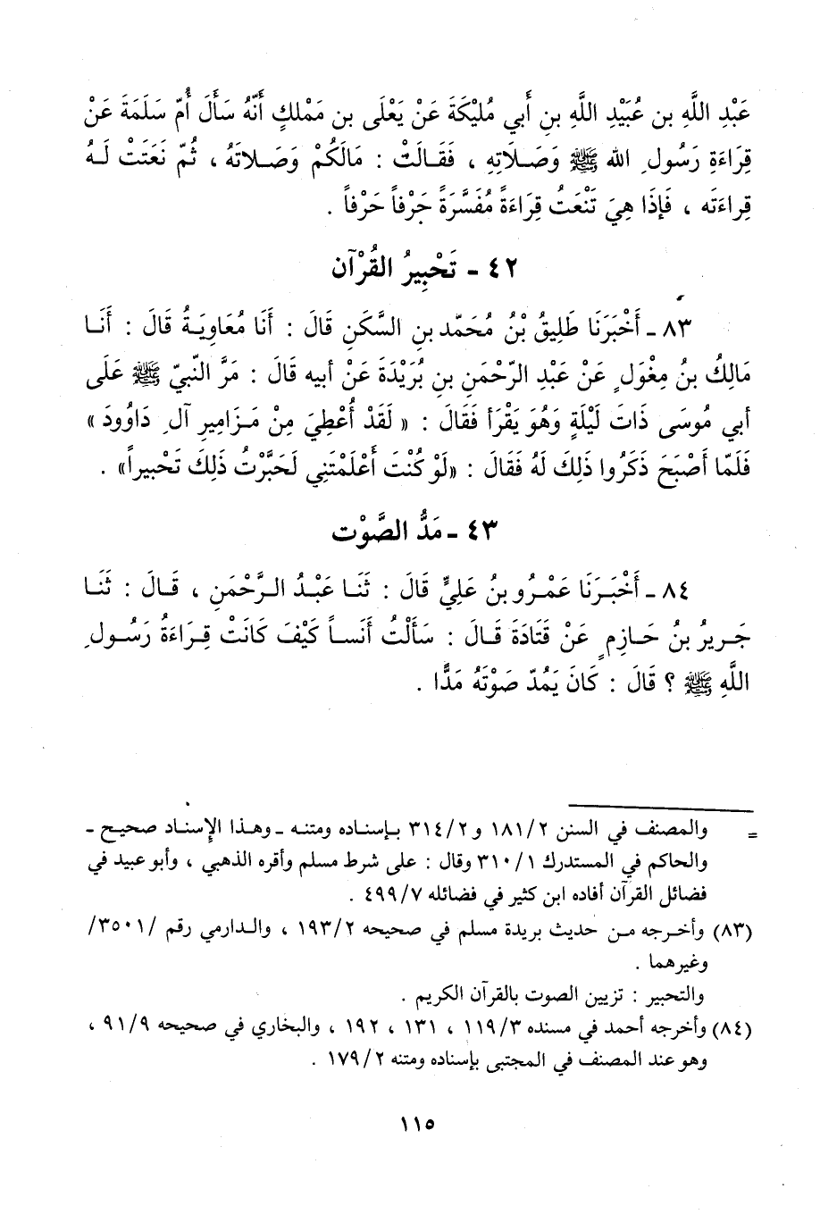 84 - أخبرنَا عَمْرو بن عَليّ قَالَ ثَنَا عبد الرَّحْمَن قَالَ ثَنَا جرير بن حَازِم عَن قَتَادَة قَالَ سَأَلت أنسا كَيفَ كَانَت قِرَاءَة رَسُول الله قَالَ كَانَ يمد صَوته مدا