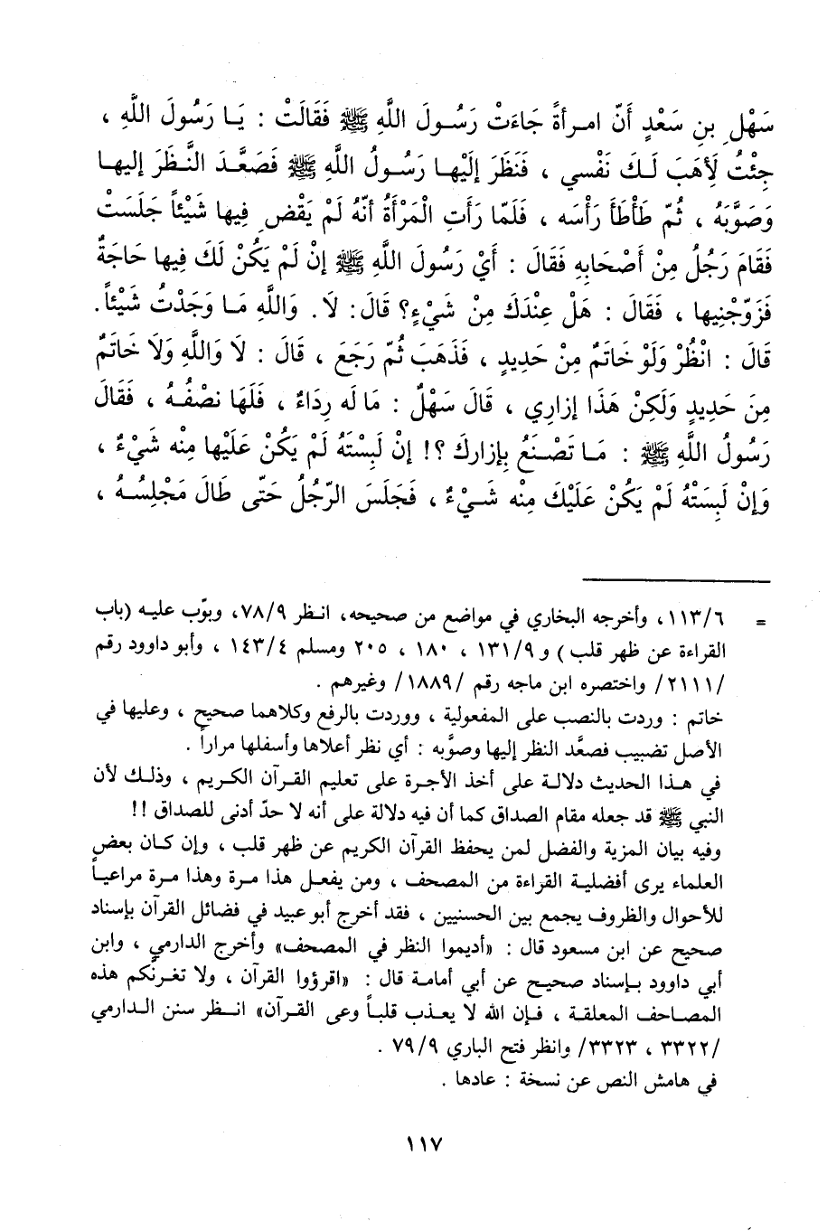سهل بن سعد أَن امْرَأَة جَاءَت رَسُول الله فَقَالَت يَا رَسُول الله جِئْت لأهب لَك نَفسِي فَنظر إِلَيْهَا رَسُول الله فَصَعدَ النّظر إِلَيْهَا وَصَوَّبَهُ ثمَّ طأطأ رَأسه فَلَمَّا رَأَتْ الْمَرْأَة أَنه لم يقْض فِيهَا شَيْئا جَلَست فَقَامَ رجل من أَصْحَابه فَقَالَ أَي رَسُول الله إِن لم يكن لَك فِيهَا حَاجَة فزوجنيها فَقَالَ هَل عنْدك من شَيْء قَالَ لَا وَالله مَا وجدت شَيْئا قَالَ انْظُر وَلَو خَاتم من حَدِيد فَذهب ثمَّ رَجَعَ قَالَ لَا وَالله وَلَا خَاتم من حَدِيد وَلَكِن هَذَا إزَارِي قَالَ سهل مَا لَهُ رِدَاء فلهَا نصفه فَقَالَ رَسُول الله مَا تصنع بإزارك إِن لبسته لم يكن عَلَيْهَا مِنْهُ شَيْء وَإِن لبسته لم يكن عَلَيْك مِنْهُ شَيْء فَجَلَسَ الرجل حَتَّى طَال مَجْلِسه