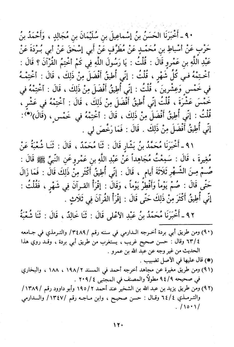 90 - أخبرنَا الْحسن بن إِسْمَاعِيل بن سُلَيْمَان بن مجَالد وَأحمد بن حَرْب عَن أَسْبَاط بن مُحَمَّد عَن مطرف عَن أبي إِسْحَق عَن أبي بردة عَن عبد الله بن عَمْرو قَالَ قلت يَا رَسُول الله فِي كم أختم الْقُرْآن قَالَ اختمه فِي كل شهر قلت إِنِّي أُطِيق أفضل من ذَلِك قَالَ اختمه فِي خمس وَعشْرين قلت إِنِّي أُطِيق أفضل من ذَلِك قَالَ اختمه فِي خمس عشرَة قلت إِنِّي أُطِيق أفضل من ذَلِك قَالَ اختمه فِي عشر قلت إِنِّي أُطِيق أفضل من ذَلِك قَالَ اختمه فِي خمس قَالَ إِنِّي أُطِيق أفضل من ذَلِك قَالَ فَمَا رخص لي