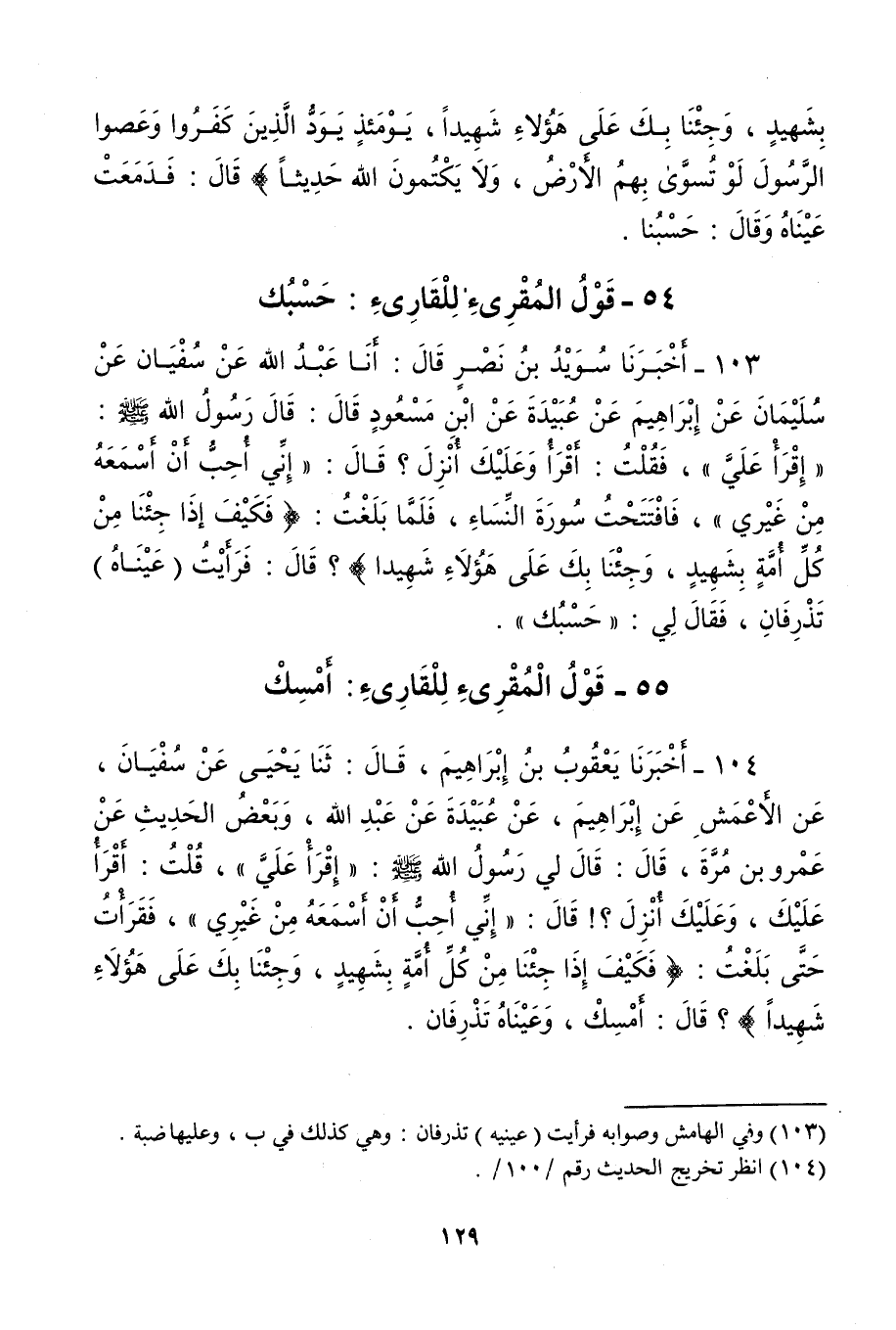 103 - أخبرنَا سُوَيْد بن نصر قَالَ أَنا عبد الله عَن سُفْيَان عَن سُلَيْمَان عَن إِبْرَاهِيم عَن عُبَيْدَة عَن ابْن مَسْعُود قَالَ قَالَ رَسُول الله إقرأ عَليّ فَقلت أَقرَأ وَعَلَيْك أنزل قَالَ إِنِّي أحب أَن أسمعهُ من غَيْرِي فافتتحت سُورَة النِّسَاء فَلَمَّا بلغت ( {فَكيف إِذا جِئْنَا من كل أمة بِشَهِيد وَجِئْنَا بك على هَؤُلَاءِ شَهِيدا} ) قَالَ فَرَأَيْت عَيناهُ تَذْرِفَانِ فَقَالَ لي حَسبك