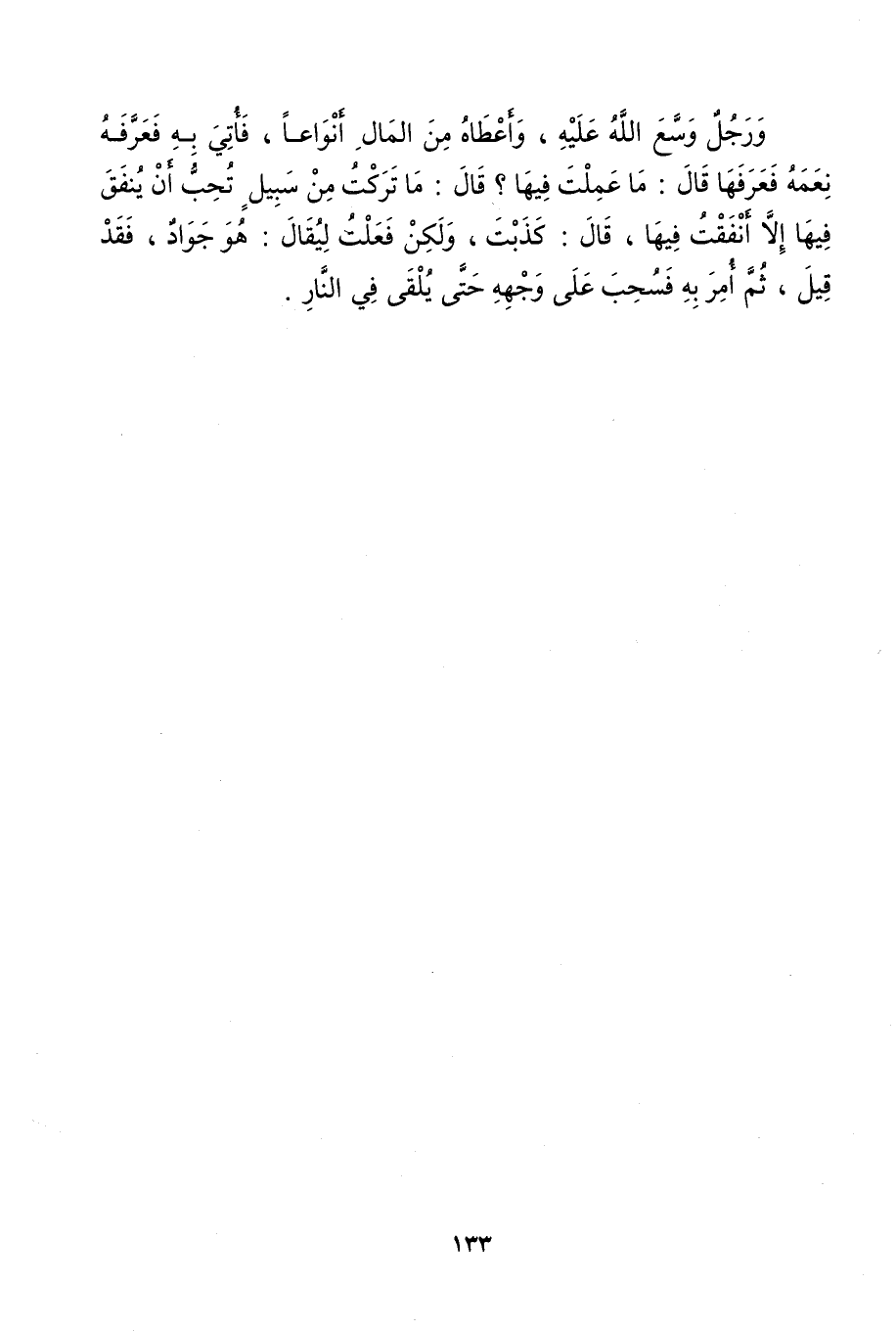 وَرجل وسع الله عَلَيْهِ وَأَعْطَاهُ من المَال أنواعا فَأتي بِهِ فَعرفهُ نعمه فعرفها قَالَ مَا عملت فِيهَا قَالَ مَا تركت من سَبِيل تحب أَن ينْفق فِيهَا إِلَّا أنفقت فِيهَا قَالَ كذبت وَلَكِن فعلت ليقال هُوَ جواد فقد قيل ثمَّ أَمر بِهِ فسحب على وَجهه حَتَّى يلقى فِي النَّار