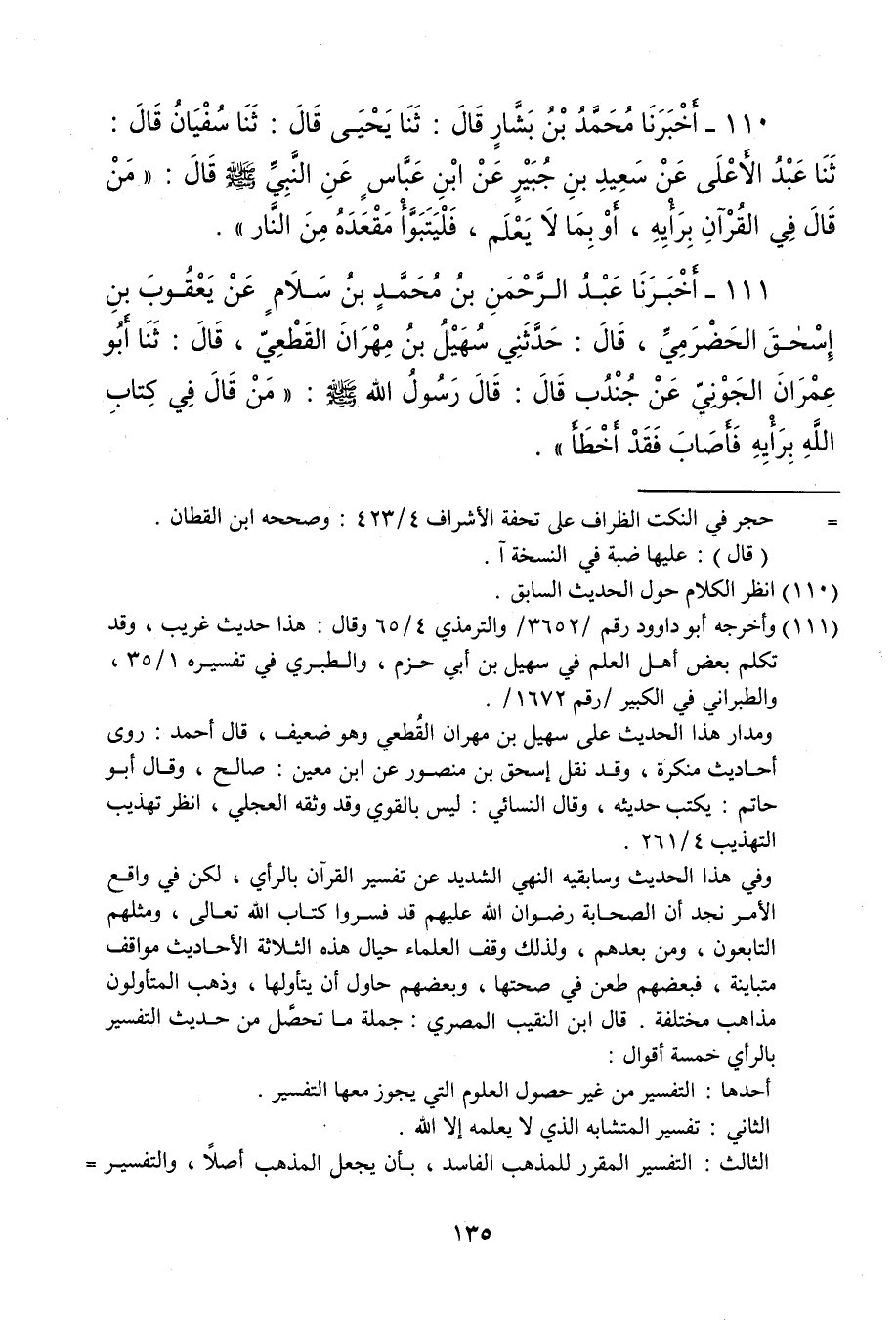 110 - أخبرنَا مُحَمَّد بن بشار قَالَ ثَنَا يحيى قَالَ ثَنَا سُفْيَان قَالَ ثَنَا عبد الْأَعْلَى عَن سعيد بن جُبَير عَن ابْن عَبَّاس عَن النَّبِي قَالَ من قَالَ فِي الْقُرْآن بِرَأْيهِ أَو بِمَا لَا يعلم فَليَتَبَوَّأ مَقْعَده من النَّار