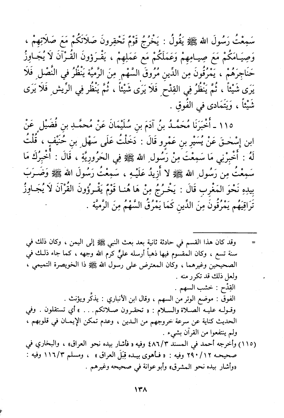 115 - أخبرنَا مُحَمَّد بن آدم بن سُلَيْمَان عَن مُحَمَّد بن فُضَيْل عَن ابْن إِسْحَق عَن يسير بن عَمْرو قَالَ دخلت على سهل بن حنيف قلت لَهُ أَخْبرنِي مَا سَمِعت من رَسُول الله فِي الحرورية قَالَ أخْبرك مَا سَمِعت من رَسُول الله لَا أَزِيد عَلَيْهِ سَمِعت رَسُول الله وَضرب بِيَدِهِ نَحْو الْمغرب قَالَ يخرج من هَا هُنَا قوم يقرؤون الْقُرْآن لَا يُجَاوز تراقيهم يَمْرُقُونَ من الدّين كَمَا يَمْرُق السهْم من الرَّمية