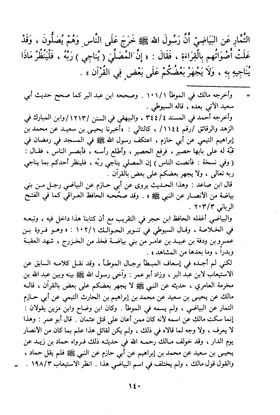 التمار عَن البياضي أَن رَسُول الله خرج على النَّاس وهم يصلونَ وَقد علت أَصْوَاتهم بِالْقِرَاءَةِ فَقَالَ إِن الْمُصَلِّي يُنَاجِي ربه فَلْينْظر مَاذَا يناجيه بِهِ وَلَا يجْهر بَعْضكُم على بعض فِي الْقُرْآن