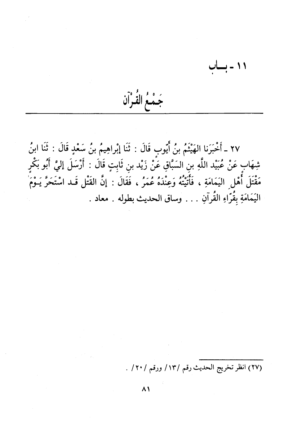 27 - أخبرنَا الْهَيْثَم بن أَيُّوب قَالَ ثَنَا إِبْرَاهِيم بن سعد قَالَ ثَنَا ابْن شهَاب عَن عبيد الله بن السباق عَن زيد بن ثَابت قَالَ أرسل إِلَيّ أَبُو بكر مقتل أهل الْيَمَامَة فَأَتَيْته وَعِنْده عمر فَقَالَ إِن الْقَتْل قد استحر يَوْم الْيَمَامَة بقراء الْقُرْآن. . وسَاق الحَدِيث بِطُولِهِ معاد