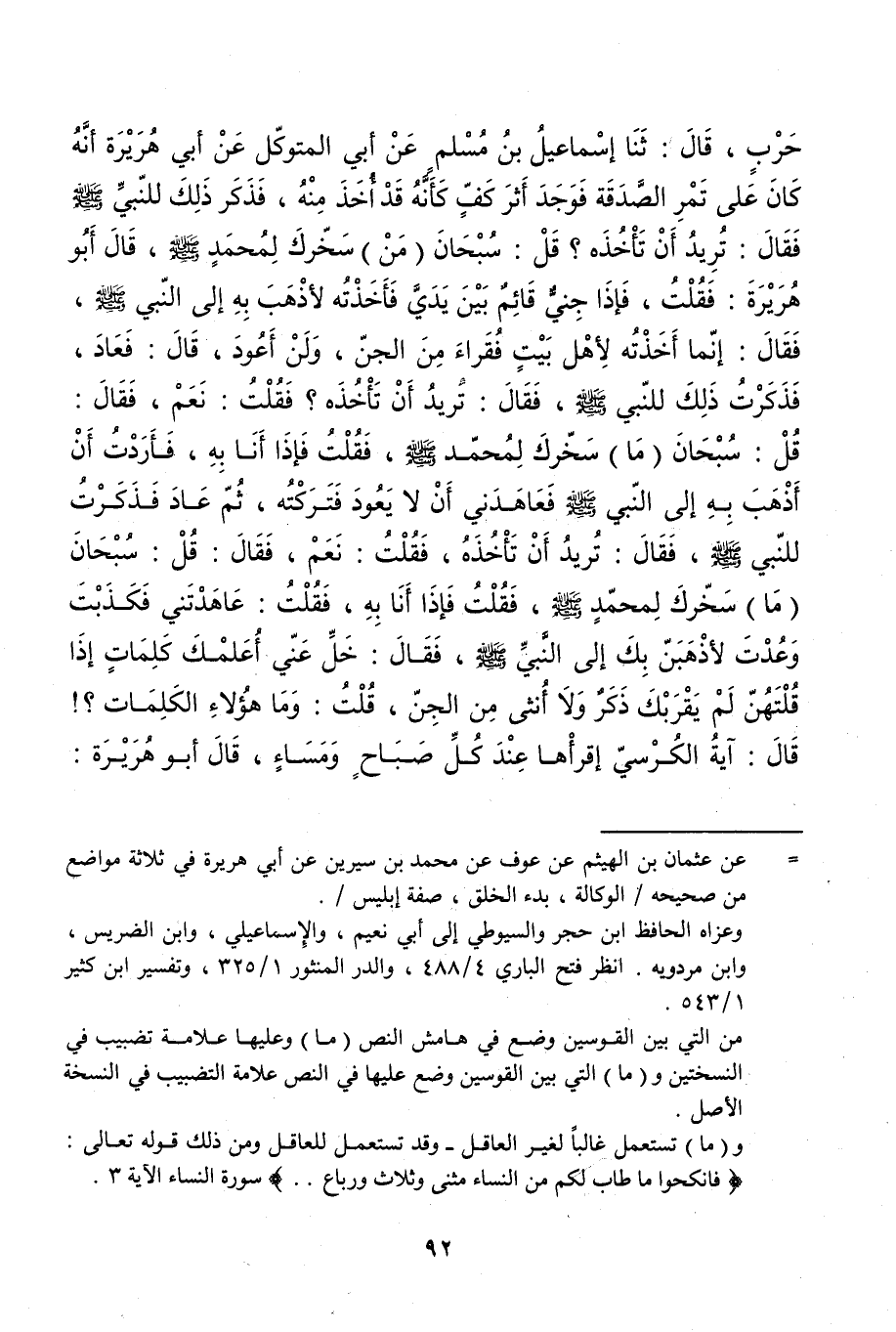 حَرْب قَالَ ثَنَا إِسْمَاعِيل بن مُسلم عَن أبي المتَوَكل عَن أبي هُرَيْرَة أَنه كَانَ على تمر الصَّدَقَة فَوجدَ أثر كف كَأَنَّهُ قد أَخذ مِنْهُ فَذكر ذَلِك للنَّبِي فَقَالَ تُرِيدُ أَن تَأْخُذهُ قل سُبْحَانَ من سخرك لمُحَمد قَالَ أَبُو هُرَيْرَة فَقلت فَإِذا جني قَائِم بَين يَدي فَأَخَذته لأذهب بِهِ إِلَى النَّبِي فَقَالَ إِنَّمَا أَخَذته لأهل بَيت فُقَرَاء من الْجِنّ وَلنْ أَعُود قَالَ فَعَاد فَذكرت ذَلِك للنَّبِي فَقَالَ تُرِيدُ أَن تَأْخُذهُ فَقلت نعم فَقَالَ قل سُبْحَانَ مَا سخرك لمُحَمد فَقلت فَإِذا أَنا بِهِ فَأَرَدْت أَن أذهب بِهِ إِلَى النَّبِي فعاهدني أَن لَا يعود فتركته ثمَّ عَاد فَذكرت للنَّبِي فَقَالَ تُرِيدُ أَن تَأْخُذهُ فَقلت نعم فَقَالَ قل سُبْحَانَ مَا سخرك لمُحَمد فَقلت فَإِذا أَنا بِهِ فَقلت عاهدتني فَكَذبت وعدت لأذهبن بك إِلَى النَّبِي فَقَالَ خل عني أعلمك كَلِمَات إِذا قلتهن لم يقربك ذكر وَلَا أُنْثَى من الْجِنّ قلت وَمَا هَؤُلَاءِ الْكَلِمَات قَالَ آيَة الْكُرْسِيّ إقرأها عِنْد كل صباح وَمَسَاء قَالَ أَبُو هُرَيْرَة