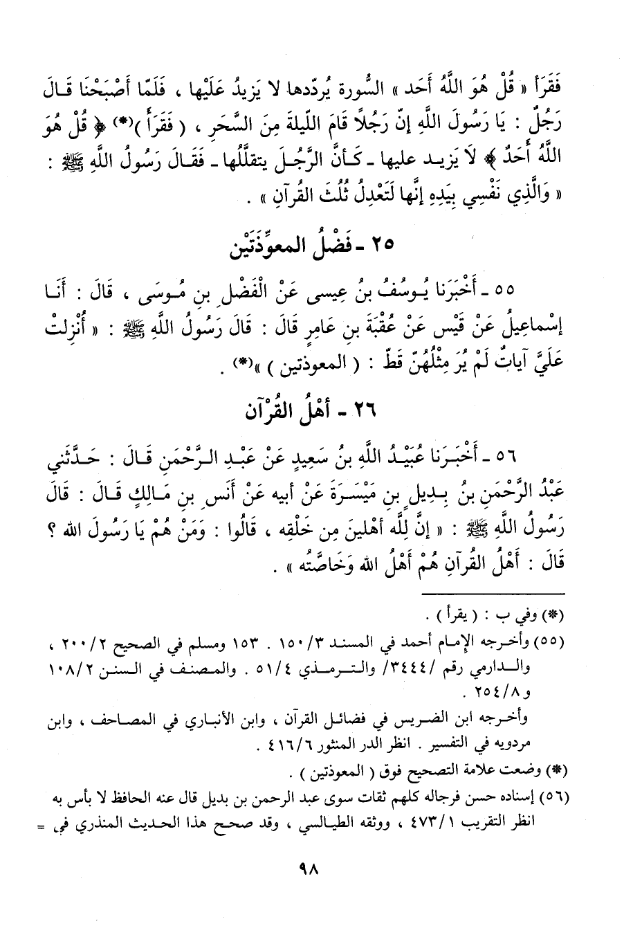 فَقَرَأَ ( {قل هُوَ الله أحد} ) السُّورَة يُرَدِّدهَا لَا يزِيد عَلَيْهَا فَلَمَّا أَصْبَحْنَا قَالَ رجل يَا رَسُول الله إِن رجلا قَامَ اللَّيْلَة من السحر فَقَرَأَ ( {قل هُوَ الله أحد} ) لَا يزِيد عَلَيْهَا كَأَن الرجل يتقللها فَقَالَ رَسُول الله وَالَّذِي نَفسِي بِيَدِهِ إِنَّهَا لتعدل ثلث الْقُرْآن