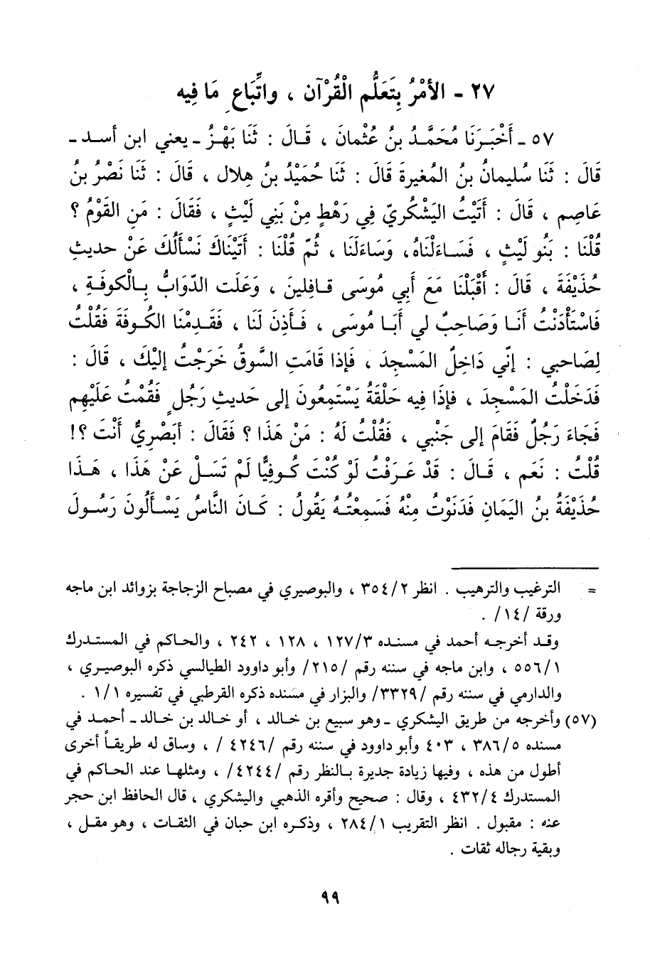 57 - أخبرنَا مُحَمَّد بن عُثْمَان قَالَ ثَنَا بهز يَعْنِي ابْن أَسد قَالَ ثَنَا سُلَيْمَان بن الْمُغيرَة قَالَ ثَنَا حميد بن هِلَال قَالَ ثَنَا نصر بن عَاصِم قَالَ أتيت الْيَشْكُرِي فِي رَهْط من بني لَيْث فَقَالَ من الْقَوْم قُلْنَا بَنو لَيْث فساءلناه وساءلنا ثمَّ قُلْنَا أَتَيْنَاك نَسْأَلك عَن حَدِيث حُذَيْفَة قَالَ أَقبلنَا مَعَ أبي مُوسَى قافلين وعلت الدَّوَابّ بِالْكُوفَةِ فاستأذنت أَنا وَصَاحب لي أَبَا مُوسَى فَأذن لنا فقدمنا الْكُوفَة فَقلت لصاحبي إِنِّي دَاخل الْمَسْجِد فَإِذا قَامَت السُّوق خرجت إِلَيْك قَالَ فَدخلت الْمَسْجِد فَإِذا فِيهِ حَلقَة يَسْتَمِعُون إِلَى حَدِيث رجل فَقُمْت عَلَيْهِم فجَاء رجل فَقَامَ إِلَى جَنْبي فَقلت لَهُ من هَذَا فَقَالَ أبصري أَنْت قلت نعم قَالَ قد عرفت لَو كنت كوفيا لم تسل عَن هَذَا هَذَا حُذَيْفَة بن الْيَمَان فدنوت مِنْهُ فَسَمعته يَقُول كَانَ النَّاس يسْأَلُون رَسُول