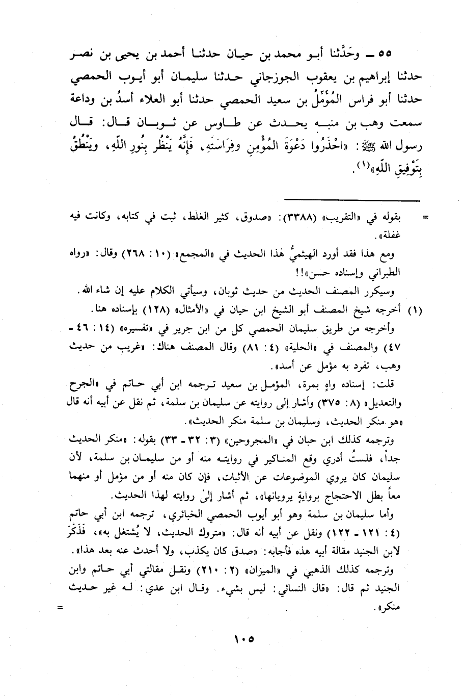 55 - وَحَدَّثَنَا أَبُو مُحَمَّدِ بْنُ حَيَّانَ، حَدَّثَنَا أَحْمَدُ بْنُ يَحْيى بْنِ نَصْرٍ، حَدَّثَنَا إِبْرَاهِيمُ بْنُ يَعْقُوبَ الْجَوْزَجَانِيُّ، حَدَّثَنَا سُلَيْمَانُ أَبُو أَيُّوبَ الْحِمْصِيُّ، حَدَّثَنَا أَبُو فِرَاسٍ الْمُؤَمِّلُ بْنُ سَعِيدٍ الْحِمْصِيُّ، حَدَّثَنَا أَبُو الْعَلَاءِ أَسَدُ بْنُ وَدَاعَةَ، سَمِعْتُ وَهْبَ بْنَ مُنَبِّهٍ، يُحَدِّثُ، عَنْ طَاوُسٍ، عَنْ ثَوْبَانَ، قَالَ: قَالَ رَسُولُ اللَّهِ صَلَّى اللَّهُ عَلَيْهِ وَسَلَّمَ: «§احْذَرُوا دَعْوَةَ الْمُؤْمِنِ وَفِرَاسَتَهُ، فَإِنَّهُ يَنْظُرُ بِنُورِ اللَّهِ؟، وَيَنْطِقُ بِتَوْفِيقِ اللَّهِ»