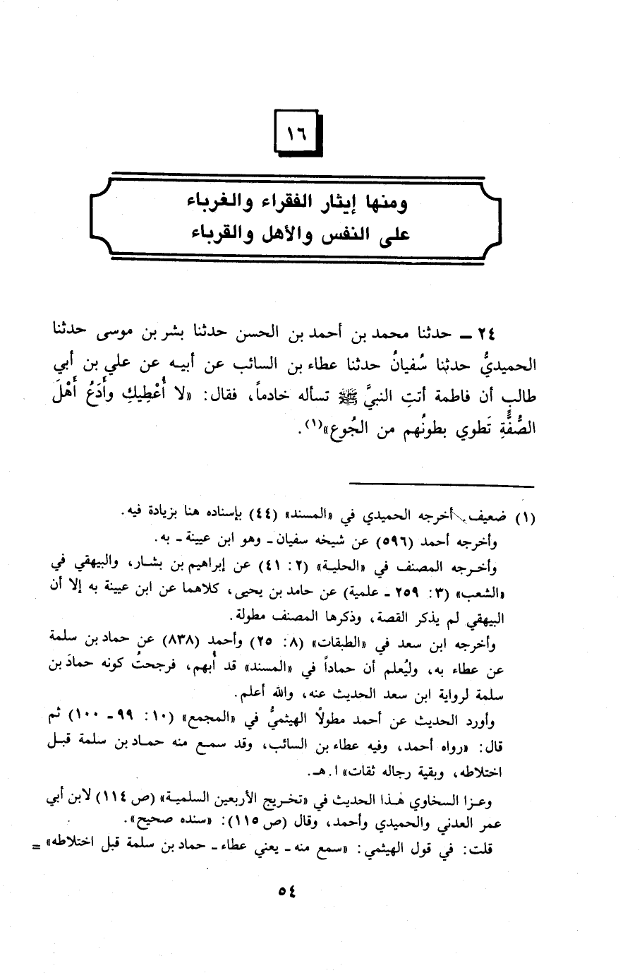 24 - حَدَّثَنَا مُحَمَّدُ بْنُ أَحْمَدَ بْنِ الْحَسَنِ، حَدَّثَنَا بِشْرُ بْنُ مُوسَى، حَدَّثَنَا الْحُمَيْدِيُّ، حَدَّثَنَا سُفْيَانُ، حَدَّثَنَا عَطَاءُ بْنُ السَّائِبِ، عَنْ أَبِيهِ، عَنْ عَلِيِّ بْنِ أَبِي طَالِبٍ، أَنَّ فَاطِمَةَ، أَتَتِ النَّبِيَّ صَلَّى اللَّهُ عَلَيْهِ وَسَلَّمَ تَسْأَلُهُ خَادِمًا، فَقَالَ: §«لَا أُعْطِيكِ وَأَدَعُ أَهْلَ الصُّفَّةِ تُطْوَى بُطُونُهُمْ مِنَ الْجُوعِ» .