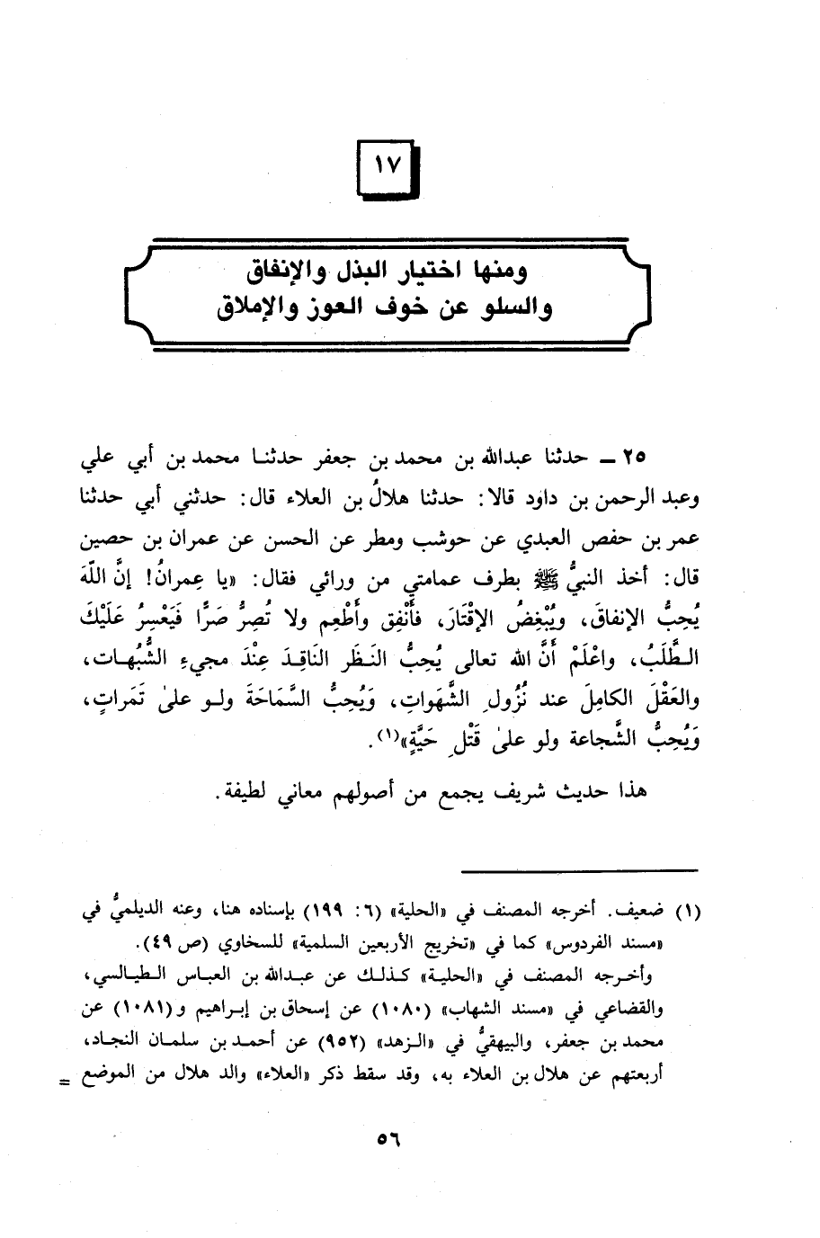 25 - حَدَّثَنَا عَبْدُ اللَّهِ بْنُ مُحَمَّدِ بْنِ جَعْفَرٍ، حَدَّثَنَا مُحَمَّدُ بْنُ أَبِي عَلِيٍّ، وَعَبْدُ الرَّحْمَنِ بْنُ دَاوُدَ، قَالَا: حَدَّثَنَا هِلَالُ بْنُ الْعَلَاءِ، قَالَ: حَدَّثَنِي أَبِي، حَدَّثَنَا عُمَرُ بْنُ حَفْصٍ الْعَبْدِيُّ، عَنْ حَوْشَبٍ، وَمَطَرٍ، عَنِ الْحَسَنِ، عَنْ عِمْرَانَ بْنِ حُصَيْنٍ، قَالَ: أَخَذَ النَّبِيُّ صَلَّى اللَّهُ عَلَيْهِ وَسَلَّمَ بِطَرَفِ عِمَامَتِي مِنْ وَرَائِي فَقَالَ: «يَا عِمْرَانُ إِنَّ §اللَّهَ يُحِبُّ الْإِنْفَاقَ، وَيُبْغِضُ الْإِقْتَارَ، فَأَنْفَقْ وَأَطْعِمْ، وَلَا تُصِرُّ صَرًّا فَيَعْسُرَ عَلَيْكَ الطَّلَبُ، وَاعْلَمْ أَنَّ اللَّهَ تَعَالَى يُحِبُّ النَّظَرَ النَّاقِدَ عِنْدَ مَجِيءِ الشُّبُهَاتِ، وَالْعَقْلَ الْكَامِلَ عِنْدَ نُزُولِ الشَّهَوَاتِ، وَيُحِبُّ السَّمَاحَةَ وَلَوْ عَلَى تَمَرَاتٍ، وَيُحِبُّ الشَّجَاعَةَ وَلَوْ عَلَى قَتْلِ حَيَّةٍ» . هَذَا حَدِيثٌ شَرِيفٌ يَجْمَعُ مِنْ أُصُولِهِمْ مَعَانِيَ لَطِيفَةً