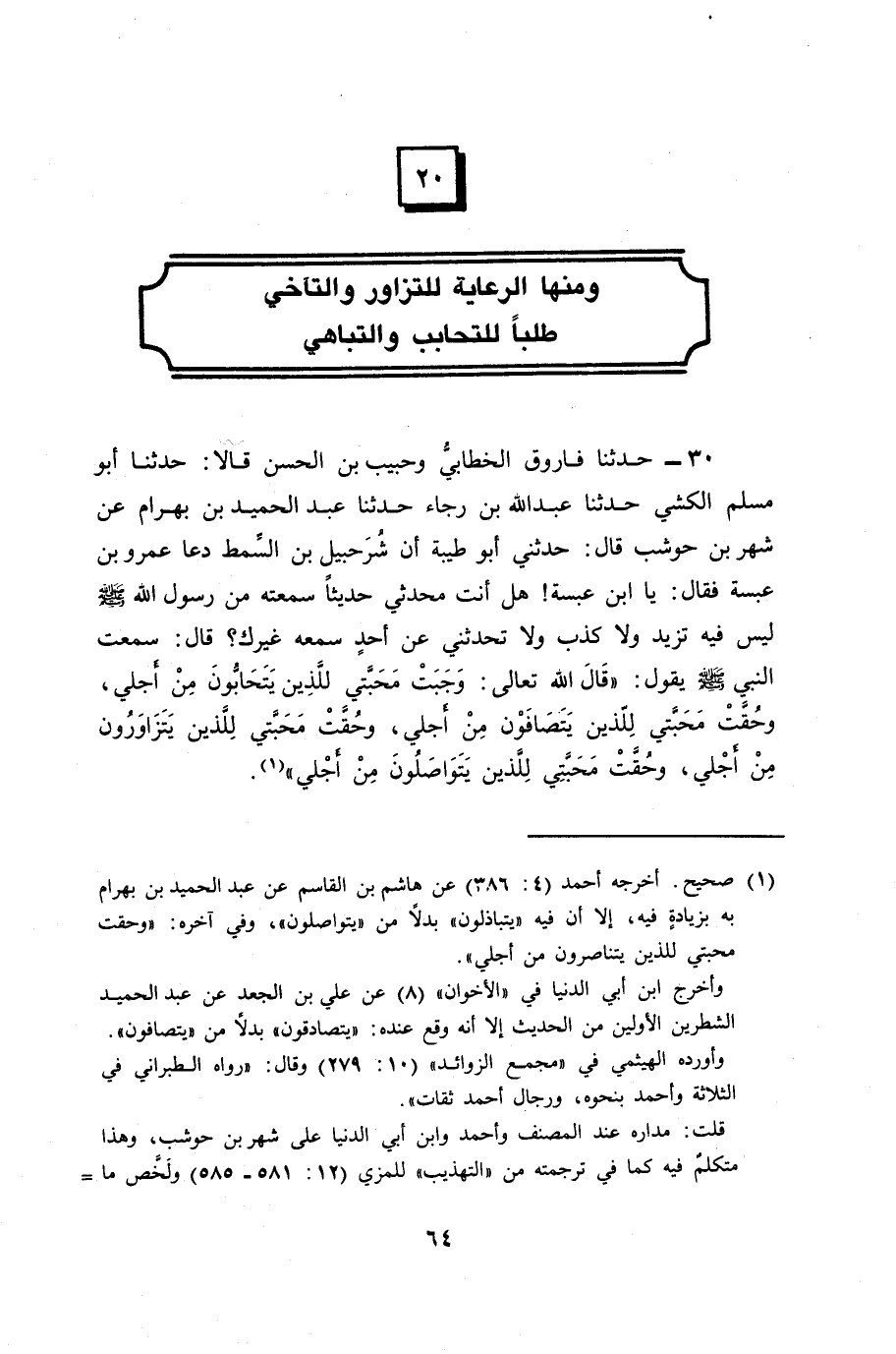 30 - حَدَّثَنَا فَارُوقٌ الْخَطَّابِيُّ، وَحَبِيبُ بْنُ الْحَسَنِ، قَالَا: حَدَّثَنَا أَبُو مُسْلِمٍ الْكَشِّيِّ، حَدَّثَنَا عَبْدُ اللَّهِ بْنُ رَجَاءٍ، حَدَّثَنَا عَبْدُ الْحَمِيدِ بْنُ بَهْرَامَ، عَنْ شَهْرِ بْنِ حَوْشَبٍ، قَالَ: حَدَّثَنِي أَبُو طَيْبَةَ، أَنَّ شُرَحْبِيلَ بْنَ السِّمْطِ، دَعَا عَمْرَو بْنَ عَبَسَةَ فَقَالَ: يَا ابْنَ عَبَسَةَ هَلْ أَنْتَ مُحَدِّثِي حَدِيثًا سَمِعْتَهُ مِنْ رَسُولِ اللَّهِ صَلَّى اللَّهُ عَلَيْهِ وَسَلَّمَ لَيْسَ فِيهِ تَزَيُّدٌ وَلَا كَذِبٌ وَلَا تُحَدِّثُنِي عَنْ أَحَدٍ سَمِعَهُ غَيْرَكَ؟ قَالَ: سَمِعْتُ النَّبِيَّ صَلَّى اللَّهُ عَلَيْهِ وَسَلَّمَ يَقُولُ: " قَالَ اللَّهُ تَعَالَى: §وَجَبَتْ مَحَبَّتِي لِلَّذِينَ يَتَحَابُّونَ مِنْ أَجْلِي، وَحَقَّتْ مَحَبَّتِي لِلَّذِينَ يَتَصَافُونَ مِنْ أَجْلِي، وَحَقَّتْ مَحَبَّتِي لِلَّذِينَ يَتَزَاوَرُونَ مِنْ أَجْلِي، وَحَقَّتْ مَحَبَّتِي لِلَّذِينَ يَتَوَاصَلُونَ مِنْ أَجْلِي "