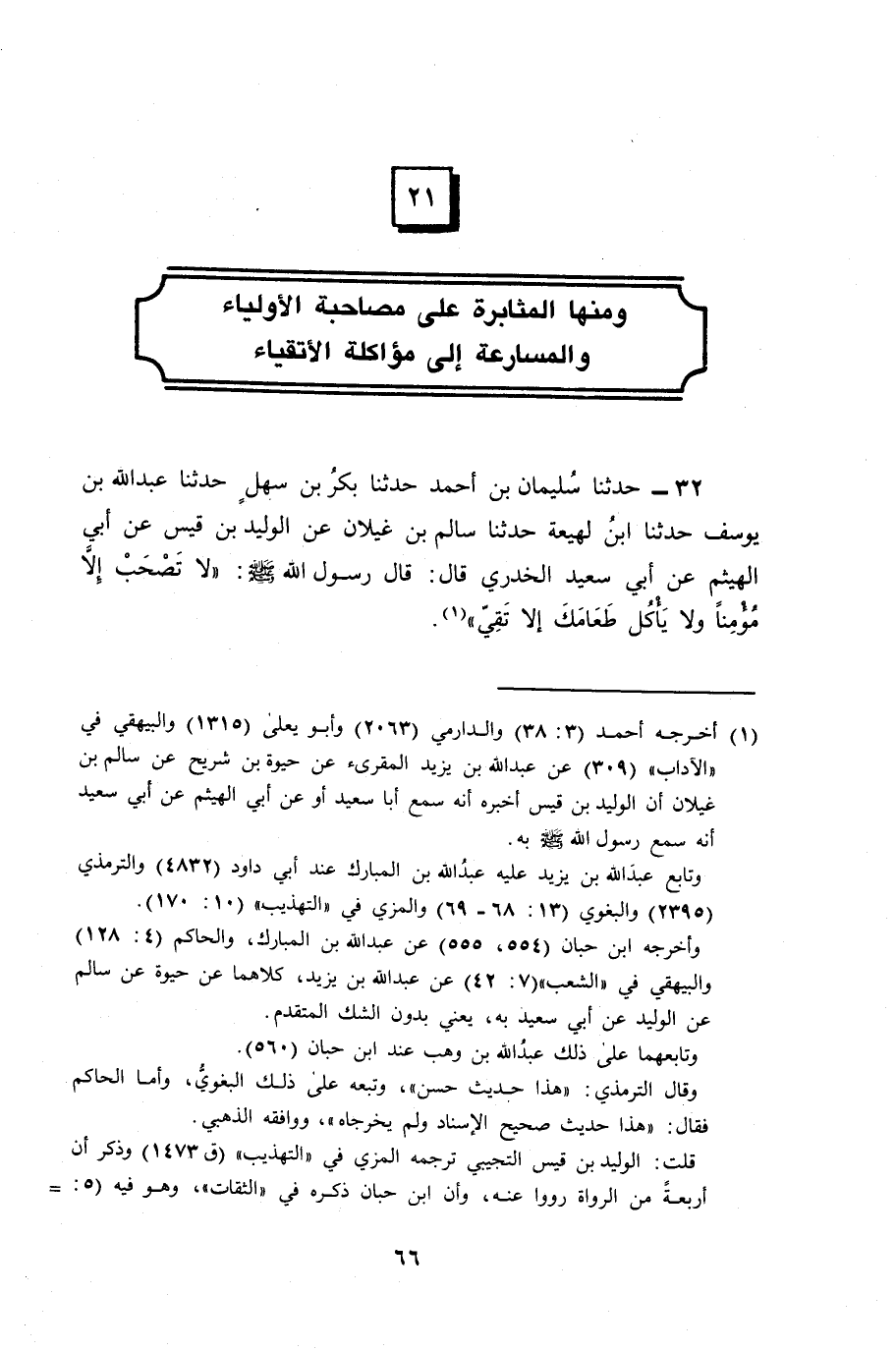 32 - حَدَّثَنَا سُلَيْمَانُ بْنُ أَحْمَدَ، حَدَّثَنَا بَكْرُ بْنُ سَهْلٍ، حَدَّثَنَا عَبْدُ اللَّهِ بْنُ يُوسُفَ، حَدَّثَنَا ابْنُ لَهِيعَةَ، حَدَّثَنَا سَالِمُ بِنُ غَيْلَانَ، عَنِ الْوَلِيدِ بْنِ قَيْسٍ، عَنْ أَبِي الْهَيْثَمِ، عَنْ أَبِي سَعِيدٍ الْخُدْرِيِّ، قَالَ: قَالَ رَسُولُ اللَّهِ صَلَّى اللَّهُ عَلَيْهِ وَسَلَّمَ: «§لَا تَصْحَبْ إِلَّا مُؤْمِنًا، وَلَا يَأْكُلْ طَعَامَكَ إِلَّا تَقِيُّ»