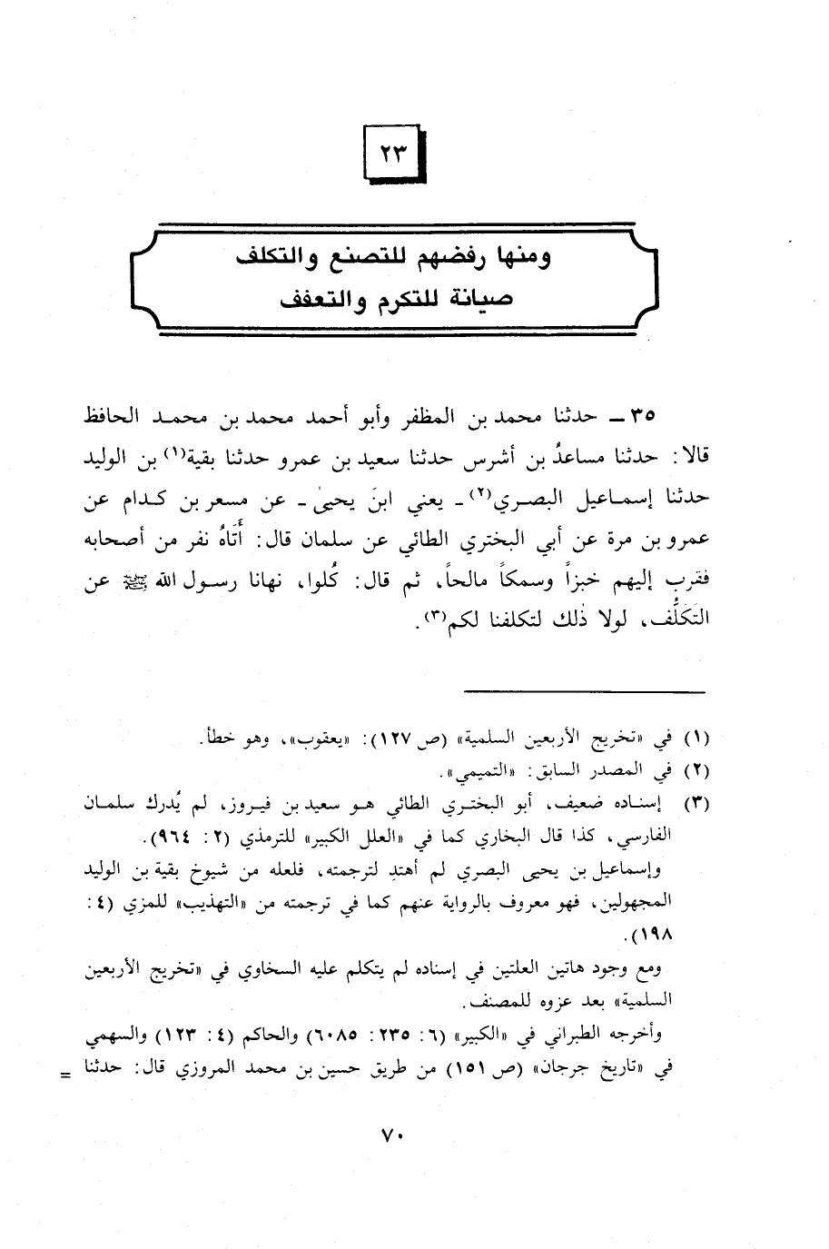 35 - حَدَّثَنَا مُحَمَّدُ بْنُ الْمُظَفَّرِ، وَأَبُو أَحْمَدَ مُحَمَّدُ بْنُ مُحَمَّدٍ الْحَافِظُ، قَالَا: حَدَّثَنَا مُسَاعِدُ بْنُ أَشْرَسَ، حَدَّثَنَا سَعِيدُ بْنُ عَمْرٍو، حَدَّثَنَا بَقِيَّةُ بْنُ الْوَلِيدِ، حَدَّثَنَا إِسْمَاعِيلُ الْبَصْرِيُّ يَعْنِي ابْنَ يَحْيَى عَنْ مِسْعَرِ بْنِ كِدَامٍ، عَنْ عَمْرِو بْنِ مُرَّةَ، عَنْ أَبِي الْبَخْتَرِيِّ الطَّائِيِّ، عَنْ سَلْمَانَ، قَالَ: أَتَاهُ نَفَرٌ مِنْ أَصْحَابِهِ فَقَرَّبَ إِلَيْهِمْ خُبْزًا وَسَمَكًا مَالِحًا، ثُمَّ قَالَ: «كُلُوا، §نَهَانَا رَسُولُ اللَّهِ صَلَّى اللَّهُ عَلَيْهِ وَسَلَّمَ عَنِ التَّكَلُّفِ، لَوْلَا ذَلِكَ لَتَكَلَّفْنَا لَكُمْ»