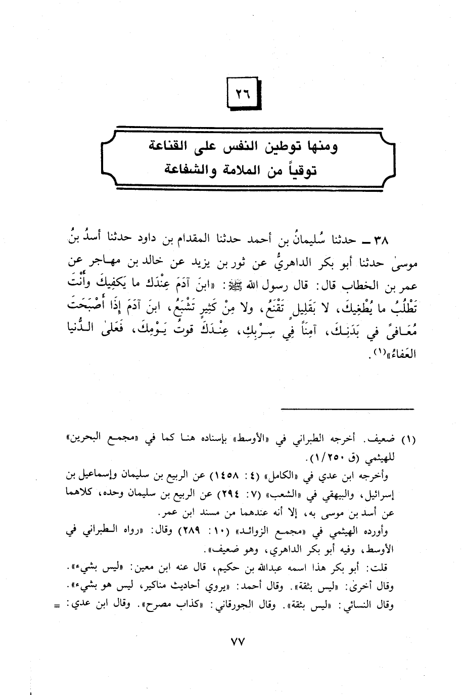 38 - حَدَّثَنَا سُلَيْمَانُ بْنُ أَحْمَدَ، حَدَّثَنَا الْمِقْدَامُ بْنُ دَاودَ، حَدَّثَنَا أَسَدُ بْنُ مُوسَى، حَدَّثَنَا أَبُو بَكْرٍ الدَّاهِرِيُّ، عَنْ ثَوْرِ بْنِ يَزِيدَ، عَنْ خَالِدِ بْنِ مُهَاجِرٍ، عَنْ عُمَرَ بْنِ الْخَطَّابِ، قَالَ: قَالَ رَسُولُ اللَّهِ صَلَّى اللَّهُ عَلَيْهِ وَسَلَّمَ: «ابْنَ آدَمَ §عِنْدَكَ مَا يَكْفِيكَ وَأَنْتَ تَطْلُبُ مَا يُطْغِيكَ، لَا بِقَلِيلٍ تَقَنَعُ، وَلَا مِنْ كَثِيرٍ تَشْبَعُ، ابْنَ آدَمَ إِذَا أَصْبَحْتَ مُعَافًى فِي بَدَنِكَ، آمِنًا فِي سِرْبِكَ، عِنْدَكَ قُوتُ يَوْمِكَ، فَعَلَى الدُّنْيَا الْعَفَاءُ»