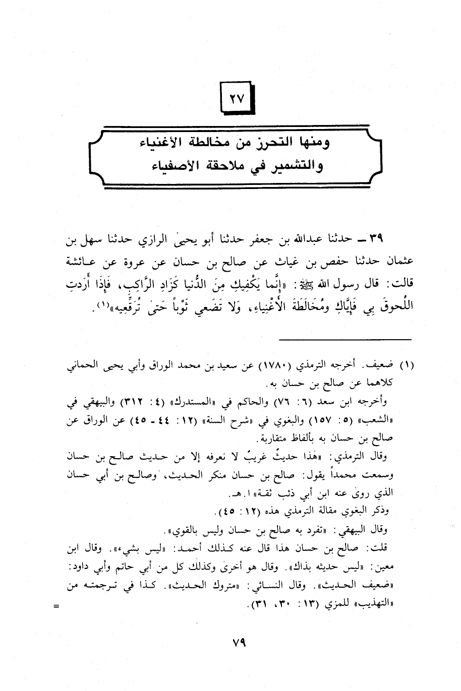 39 - حَدَّثَنَا عَبْدُ اللَّهِ بْنُ جَعْفَرٍ، حَدَّثَنَا أَبُو يَحْيَى الرَّازِيُّ، حَدَّثَنَا سَهْلُ بْنُ عُثْمَانَ، حَدَّثَنَا حَفْصُ بْنُ غِيَاثٍ، عَنْ صَالِحِ بْنِ حَسَّانَ، عَنْ عُرْوَةَ، عَنْ عَائِشَةَ، قَالَتْ: قَالَ رَسُولُ اللَّهِ صَلَّى اللَّهُ عَلَيْهِ وَسَلَّمَ: «§إِنَّمَا يَكْفِيكَ مِنَ الدُّنْيَا كَزَادِ الرَّاكِبِ، فَإِذَا أَرَدْتَ اللُّحُوقَ بِي فَإِيَّاكَ وَمُخَالَطَةَ الْأَغْنِيَاءِ، وَلَا تَضَعِي ثَوْبًا حَتَّى تُرَقِّعِيهِ»