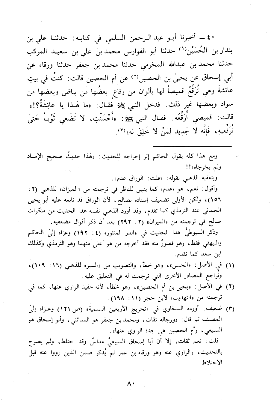 40 - أَخْبَرَنَا أَبُو عَبْدِ الرَّحْمَنِ السُّلَمِيُّ، فِي كِتَابِهِ: حَدَّثَنَا عَلِيُّ بْنُ بُنْدَارِ بْنِ الْحُسَيْنِ، حَدَّثَنَا أَبُو الْفَوَارِسِ مُحَمَّدُ بْنُ عَلِيِّ بْنِ سَعِيدٍ الْمَرْكَبُ، حَدَّثَنَا مُحَمَّدُ بْنُ عَبْدِ اللَّهِ الْمُخَرِّمِيُّ، حَدَّثَنَا مُحَمَّدُ بْنُ جَعْفَرٍ، حَدَّثَنَا وَرْقَاءُ، عَنْ أَبِي إِسْحَاقَ، عَنْ يَحْيَى بْنِ الْحُصَيْنِ، عَنْ أُمِّ الْحُصَيْنِ، قَالَتْ: كُنْتُ فِي بَيْتِ عَائِشَةَ وَهِيَ تَرْفَعُ قَمِيصًا لَهَا بِأَلْوَانٍ مِنْ رِقَاعٍ بَعْضُهَا مِنْ بَيَاضٍ وَبَعْضُهَا مِنْ سَوَادٍ، وَبَعْضُهَا غَيْرُ ذَلِكَ. فَدَخَلَ النَّبِيُّ صَلَّى اللَّهُ عَلَيْهِ وَسَلَّمَ فَقَالَ: «مَا هَذَا يَا عَائِشَةُ؟» قَالَتْ: قَمِيصِي أُرَقِّعُهُ. فَقَالَ النَّبِيُّ صَلَّى اللَّهُ عَلَيْهِ وَسَلَّمَ: «أَحْسَنْتِ، §لَا تَضَعِي ثَوْبًا حَتَّى تُرَقِّعِيهِ، فَإِنَّهُ لَا جَدِيدَ لِمَنْ لَا خَلِقَ لَهُ»
