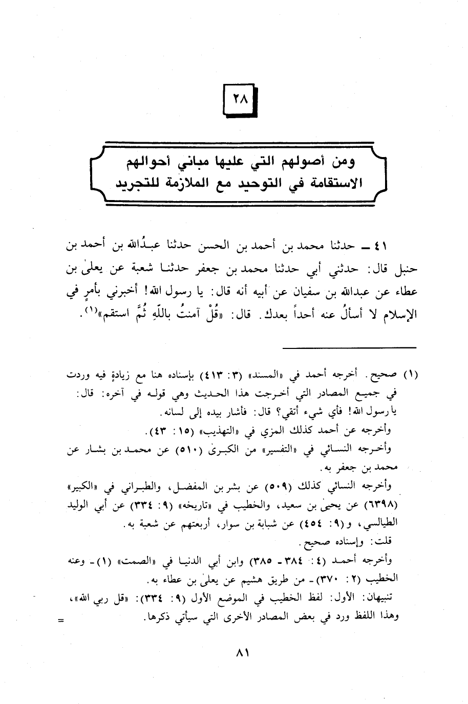 41 - حَدَّثَنَا مُحَمَّدُ بْنُ أَحْمَدَ بْنِ الْحَسَنِ، حَدَّثَنَا عَبْدُ اللَّهِ بْنُ أَحْمَدَ بْنِ حَنْبَلٍ، قَالَ: حَدَّثَنِي أَبِي، حَدَّثَنَا مُحَمَّدُ بْنُ جَعْفَرٍ، حَدَّثَنَا شُعْبَةُ، عَنْ يَعْلَى بْنِ عَطَاءٍ، عَنْ عَبْدِ اللَّهِ بْنِ سُفْيَانَ، عَنْ أَبِيهِ، أَنَّهُ قَالَ: يَا رَسُولَ اللَّهِ أَخْبِرْنِي بِأَمْرٍ، فِي الْإِسْلَامِ لَا أَسْأَلُ عَنْهُ أَحَدًا بَعْدَكَ. قَالَ: §«قُلْ آمَنْتُ بِاللَّهِ ثُمَّ اسْتَقِمْ»