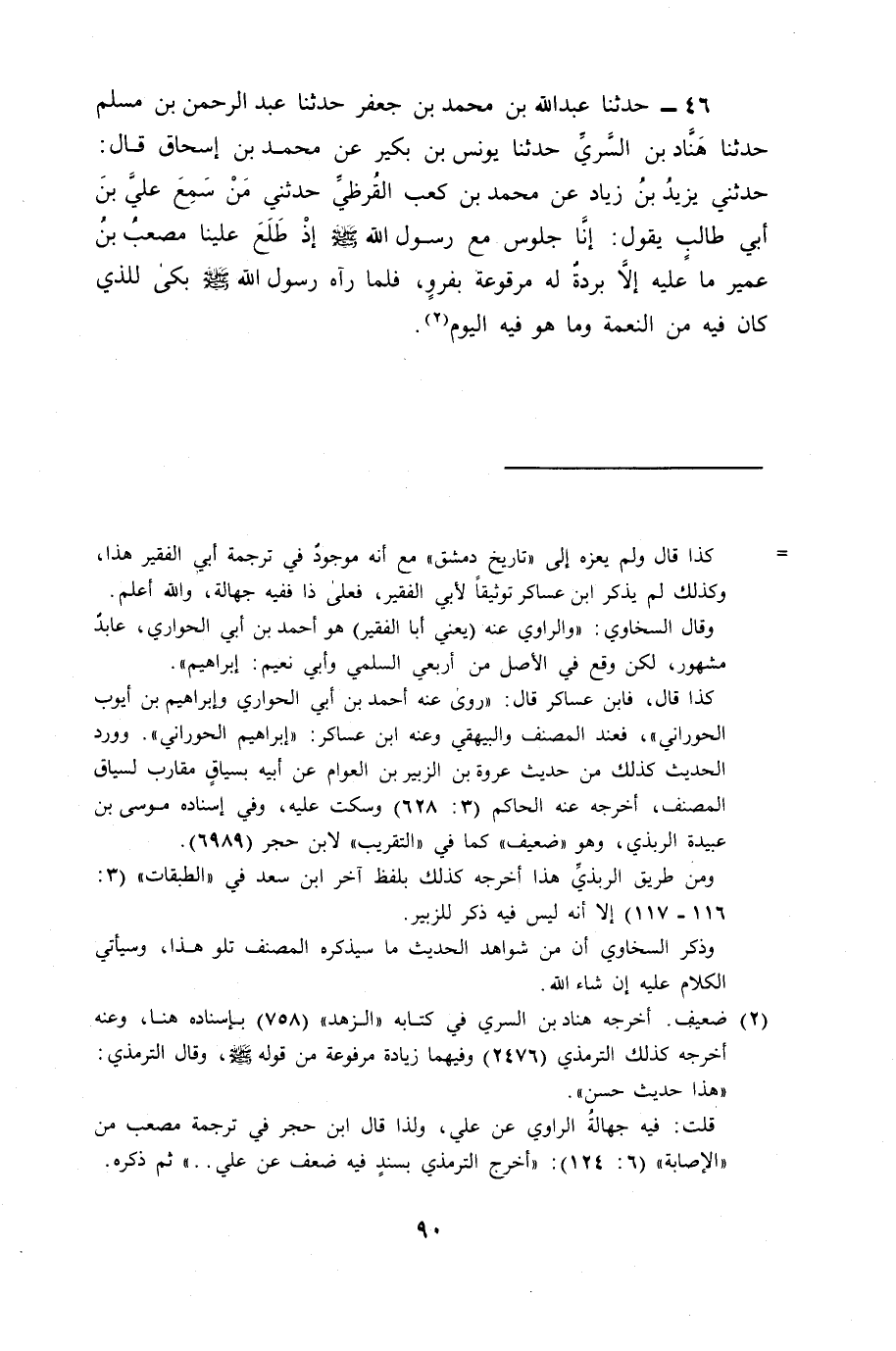 46 - حَدَّثَنَا عَبْدُ اللَّهِ بْنُ مُحَمَّدِ بْنِ جَعْفَرٍ، حَدَّثَنَا عَبْدُ الرَّحْمَنِ بْنُ مُسْلِمٍ، حَدَّثَنَا هَنَّادُ بْنُ السَّرِيِّ، حَدَّثَنَا يُونُسُ بْنُ بُكَيْرٍ، عَنْ مُحَمَّدِ بْنِ إِسْحَاقَ، قَالَ: حَدَّثَنِي يَزِيدُ بْنُ زِيَادٍ، عَنْ مُحَمَّدِ بْنِ كَعْبٍ الْقُرَظِيِّ، حَدَّثَنِي مَنْ، سَمِعَ عَلِيَّ بْنَ أَبِي طَالِبٍ، يَقُولُ: §«إِنَّا جُلُوسٌ مَعَ رَسُولِ اللَّهِ صَلَّى اللَّهُ عَلَيْهِ وَسَلَّمَ إِذْ طَلَعَ عَلَيْنَا مُصْعَبُ بْنُ عُمَيْرٍ مَا عَلَيْهِ إِلَّا بُرْدَةٌ لَهُ مَرْقُوعَةٌ بِفَرْو، فَلَمَّا رَآهُ رَسُولُ اللَّهِ صَلَّى اللَّهُ عَلَيْهِ وَسَلَّمَ بَكَى لِلَّذِي كَانَ فِيهِ مِنَ النِّعْمَةِ وَمَا هُوَ فِيهِ الْيَوْمَ»
