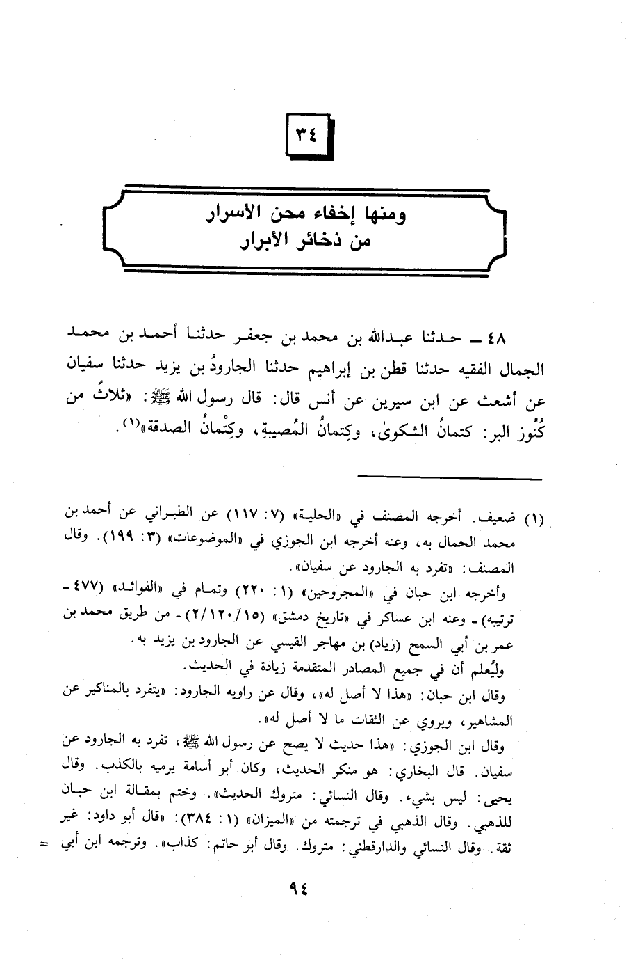 48 - حَدَّثَنَا عَبْدُ اللَّهِ بْنُ مُحَمَّدِ بْنِ جَعْفَرٍ، حَدَّثَنَا أَحْمَدُ بْنُ مُحَمَّدٍ الْجَمَالُ الْفَقِيهُ، حَدَّثَنَا قَطَنُ بْنُ إِبْرَاهِيمَ، حَدَّثَنَا الْجَارُودُ بْنُ يَزِيدَ، حَدَّثَنَا سُفْيَانُ، عَنْ أَشْعَثَ، عَنِ ابْنِ سِيرِينَ، عَنْ أَنَسٍ، قَالَ: قَالَ رَسُولُ اللَّهِ صَلَّى اللَّهُ عَلَيْهِ وَسَلَّمَ: " §ثَلَاثٌ مِنْ كُنُوزِ الْبِرِّ: كِتْمَانُ الشَّكْوَى، وَكِتْمَانُ الْمُصِيبَةِ، وَكِتْمَانُ الصَّدَقَةِ "