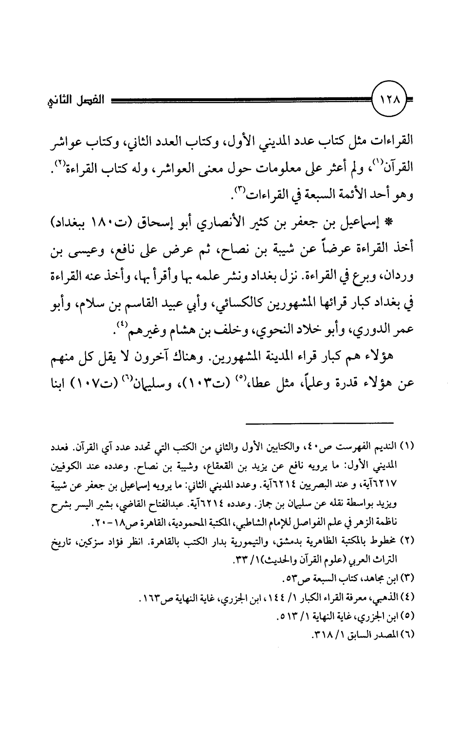 6217 اية، و عند البصريين 4 1 62 اية. وعدد المديني الثاني: ما يرويه اسماعيل بن جعفر عن شيبة