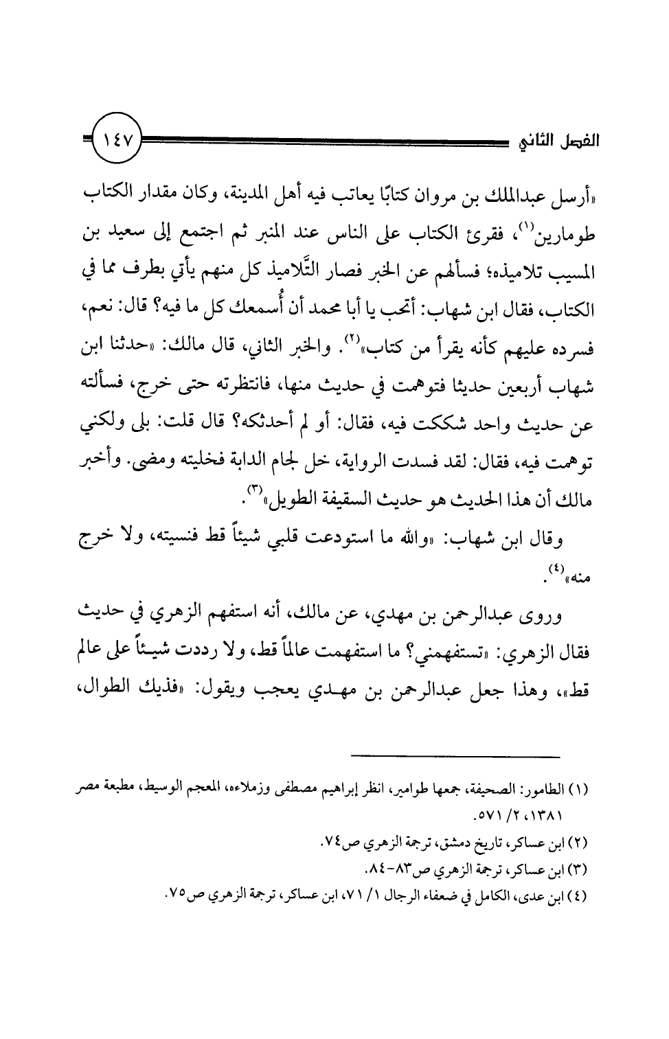 (4) ابن عدى، الكامل في ضعفاء الرجال 1/ 1 7، ابن عساكر، ترجمة الزهري ص ه 7.